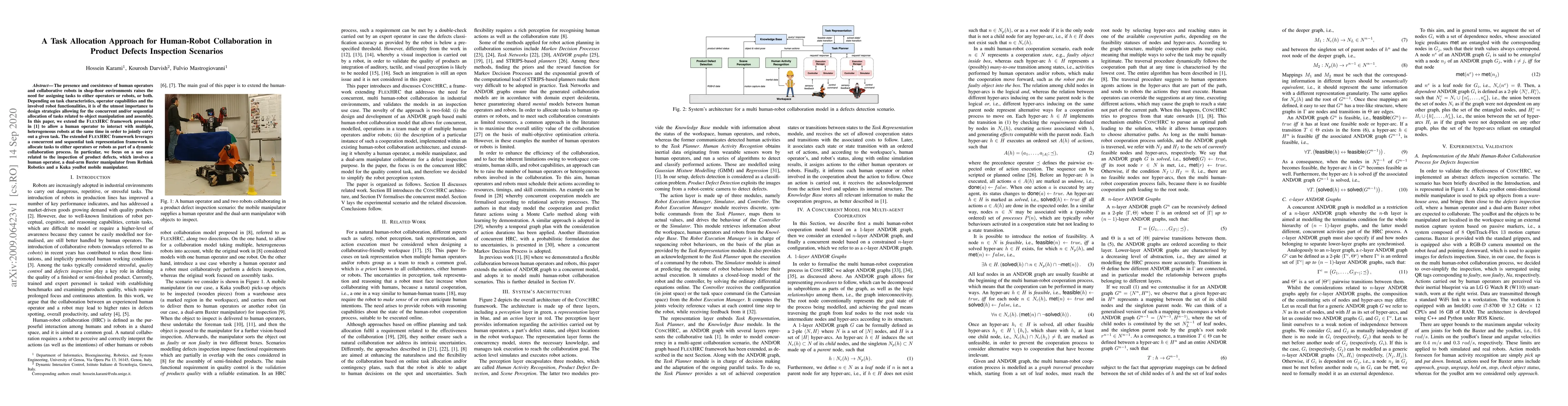 The presence and coexistence of human operators and collaborative robots in shop-floor environments raises the need for assigning tasks to either operators or robots, or both. Depending on task characteristics, operator capabilities and the involved robot functionalities, it is of the utmost importance to design strategies allowing for the concurrent and/or sequential allocation of tasks related to object manipulation and assembly. In this paper, we extend the \textsc{FlexHRC} framework presented in \cite{darvish2018flexible} to allow a human operator to interact with multiple, heterogeneous robots at the same time in order to jointly carry out a given task. The extended \textsc{FlexHRC} framework leverages a concurrent and sequential task representation framework to allocate tasks to either operators or robots as part of a dynamic collaboration process. In particular, we focus on a use case related to the inspection of product defects, which involves a human operator, a dual-arm Baxter manipulator from Rethink Robotics and a Kuka youBot mobile manipulator.