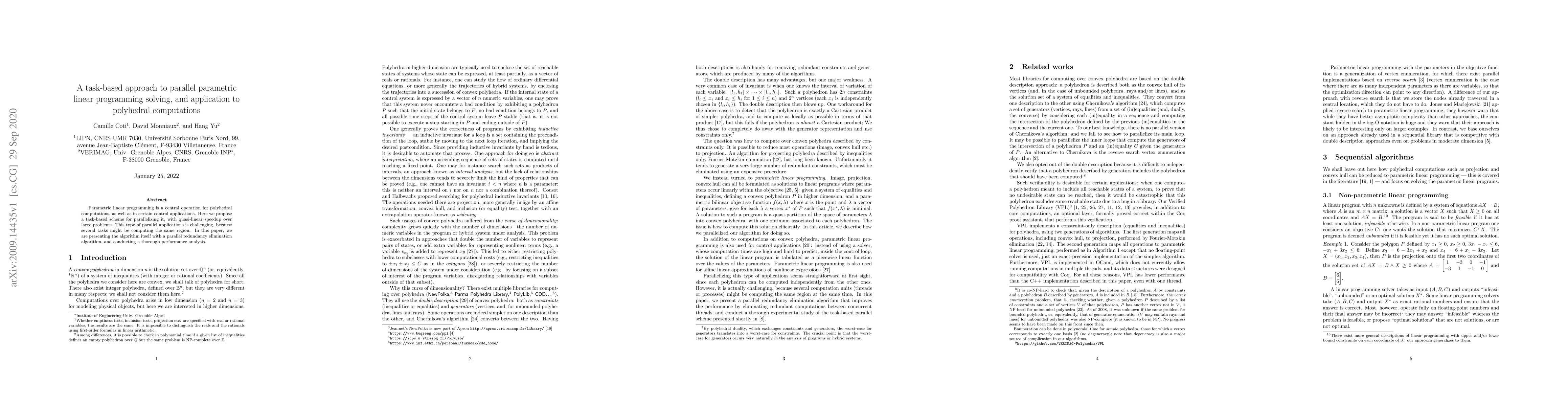 Parametric linear programming is a central operation for polyhedral computations, as well as in certain control applications.Here we propose a task-based scheme for parallelizing it, with quasi-linear speedup over large problems.This type of parallel applications is challenging, because several tasks mightbe computing the same region. In this paper, we are presenting thealgorithm itself with a parallel redundancy elimination algorithm, andconducting a thorough performance analysis.