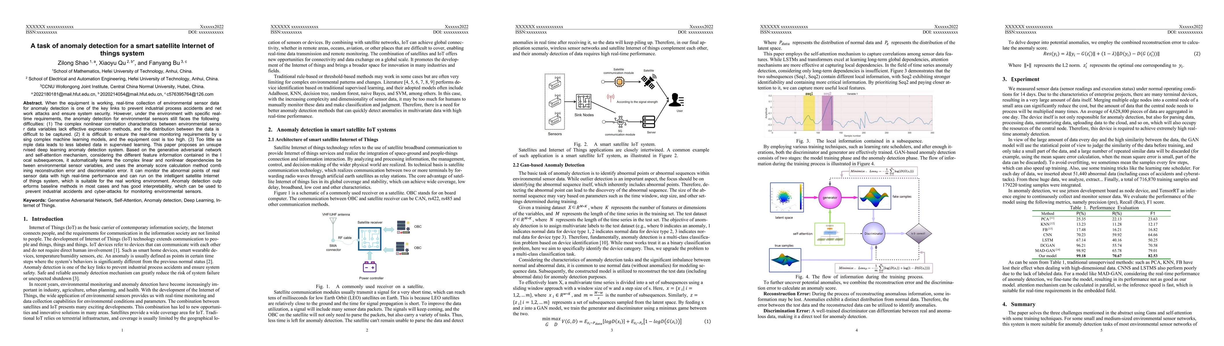 When the equipment is working, real-time collection of environmental sensor data for anomaly detection is one of the key links to prevent industrial process accidents and network attacks and ensure system security. However, under the environment with specific real-time requirements, the anomaly detection for environmental sensors still faces the following difficulties: (1) The complex nonlinear correlation characteristics between environmental sensor data variables lack effective expression methods, and the distribution between the data is difficult to be captured. (2) it is difficult to ensure the real-time monitoring requirements by using complex machine learning models, and the equipment cost is too high. (3) Too little sample data leads to less labeled data in supervised learning. This paper proposes an unsupervised deep learning anomaly detection system. Based on the generative adversarial network and self-attention mechanism, considering the different feature information contained in the local subsequences, it automatically learns the complex linear and nonlinear dependencies between environmental sensor variables, and uses the anomaly score calculation method combining reconstruction error and discrimination error. It can monitor the abnormal points of real sensor data with high real-time performance and can run on the intelligent satellite Internet of things system, which is suitable for the real working environment. Anomaly detection outperforms baseline methods in most cases and has good interpretability, which can be used to prevent industrial accidents and cyber-attacks for monitoring environmental sensors.
