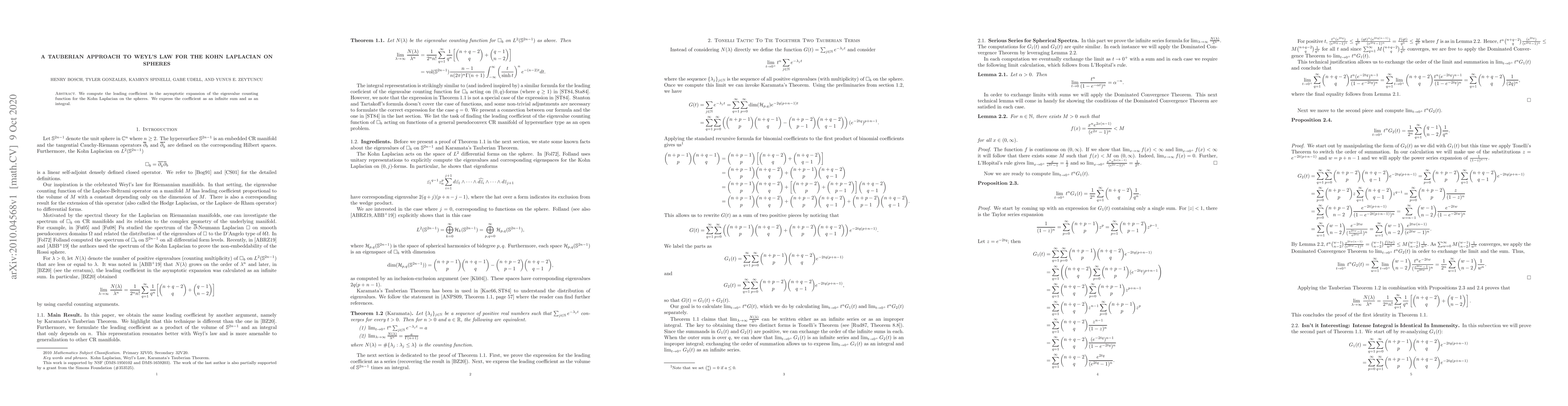 This paper determines the leading coefficient in the asymptotic expansion of the eigenvalue counting function for the Kohn Laplacian on spheres, presenting it both as an infinite sum and as an integral through a Tauberian approach.