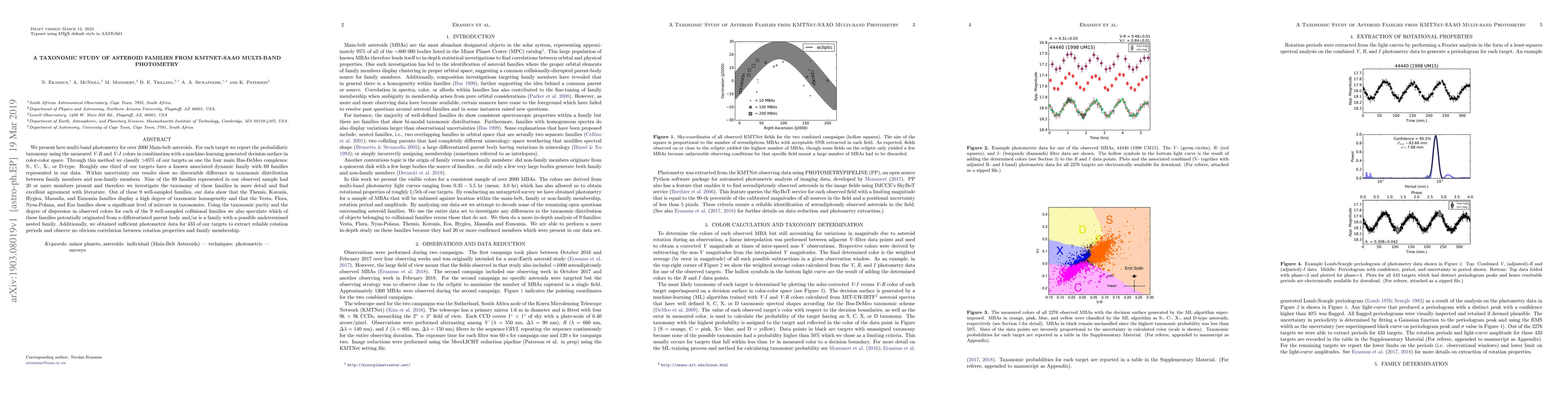 We present here multi-band photometry for over 2000 Main-belt asteroids. For each target we report the probabilistic taxonomy using the measured V-R and V-I colors in combination with a machine-learning generated decision surface in color-color space. Through this method we classify >85% of our targets as one the four main Bus-DeMeo complexes: S-, C-, X-, or D-type. Roughly one third of our targets have a known associated dynamic family with 69 families represented in our data. Within uncertainty our results show no discernible difference in taxonomic distribution between family members and non-family members. Nine of the 69 families represented in our observed sample had 20 or more members present and therefore we investigate the taxonomy of these families in more detail and find excellent agreement with literature. Out of these 9 well-sampled families, our data show that the Themis, Koronis, Hygiea, Massalia, and Eunomia families display a high degree of taxonomic homogeneity and that the Vesta, Flora, Nysa-Polana, and Eos families show a significant level of mixture in taxonomies. Using the taxonomic purity and the degree of dispersion in observed colors for each of the 9 well-sampled collisional families we also speculate which of these families potentially originated from a differentiated parent body and/or is a family with a possible undetermined nested family. Additionally, we obtained sufficient photometric data for 433 of our targets to extract reliable rotation periods and observe no obvious correlation between rotation properties and family membership.