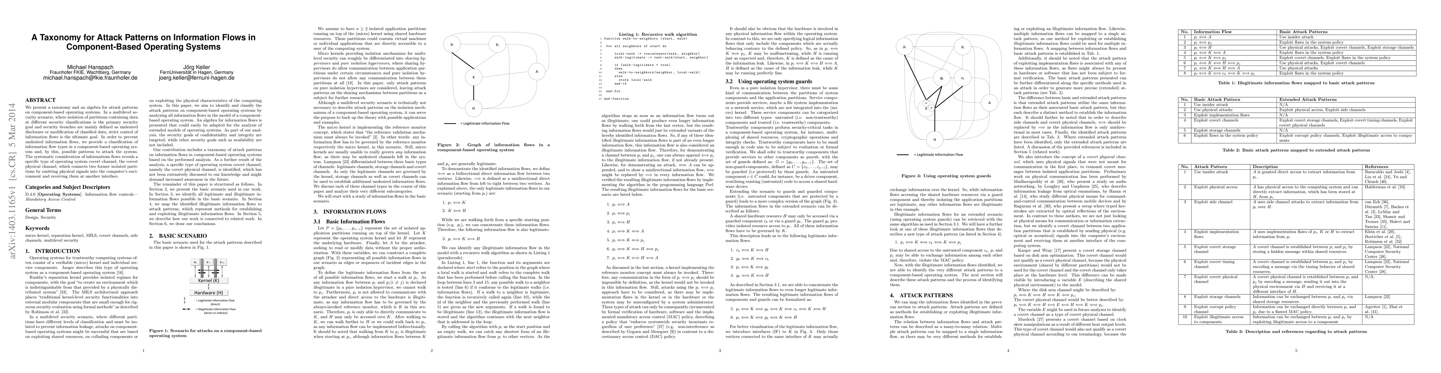 We present a taxonomy and an algebra for attack patterns on component-based operating systems. In a multilevel security scenario, where isolation of partitions containing data at different security classifications is the primary security goal and security breaches are mainly defined as undesired disclosure or modification of classified data, strict control of information flows is the ultimate goal. In order to prevent undesired information flows, we provide a classification of information flow types in a component-based operating system and, by this, possible patterns to attack the system. The systematic consideration of informations flows reveals a specific type of operating system covert channel, the covert physical channel, which connects two former isolated partitions by emitting physical signals into the computer's environment and receiving them at another interface.