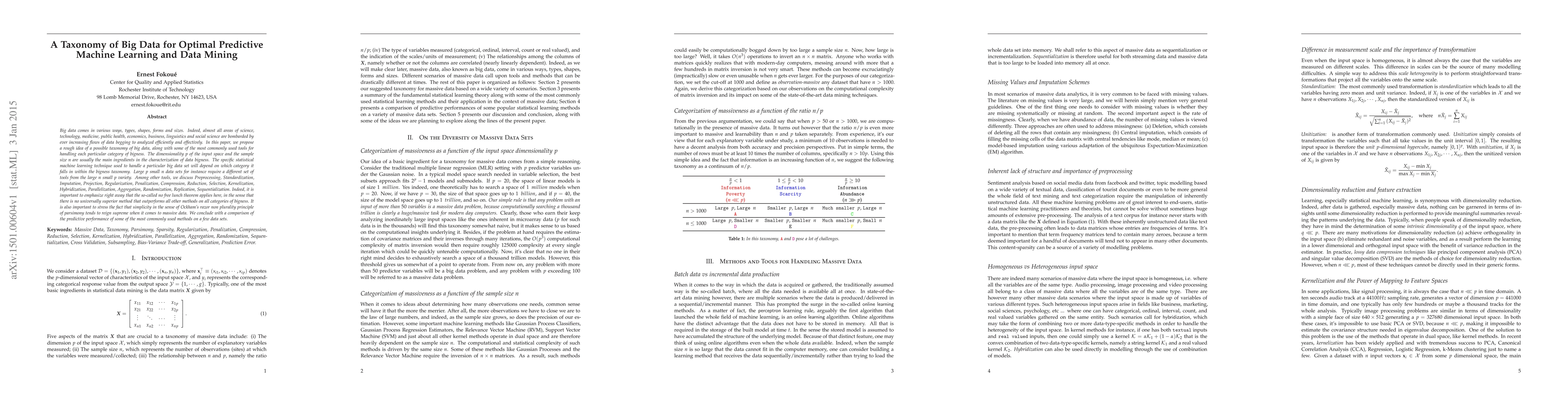 This paper proposes a taxonomy for classifying big data based on dimensionality and sample size, and discusses various tools for handling different categories. It emphasizes that no single method is universally superior and advocates for simplicity in predictive machine learning and data mining.
