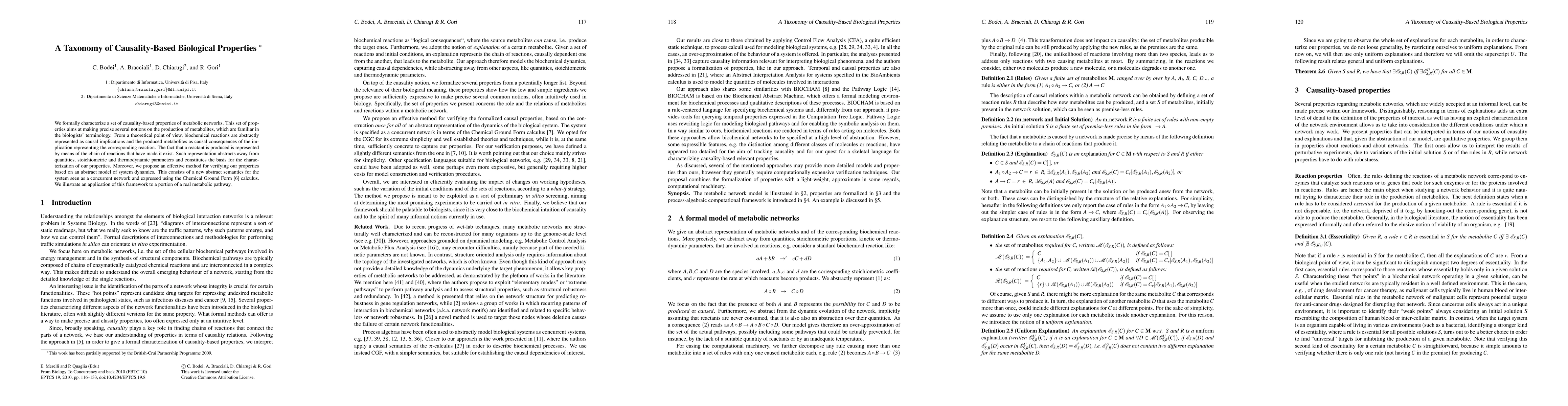 We formally characterize a set of causality-based properties of metabolic networks. This set of properties aims at making precise several notions on the production of metabolites, which are familiar in the biologists' terminology. From a theoretical point of view, biochemical reactions are abstractly represented as causal implications and the produced metabolites as causal consequences of the implication representing the corresponding reaction. The fact that a reactant is produced is represented by means of the chain of reactions that have made it exist. Such representation abstracts away from quantities, stoichiometric and thermodynamic parameters and constitutes the basis for the characterization of our properties. Moreover, we propose an effective method for verifying our properties based on an abstract model of system dynamics. This consists of a new abstract semantics for the system seen as a concurrent network and expressed using the Chemical Ground Form calculus. We illustrate an application of this framework to a portion of a real metabolic pathway.