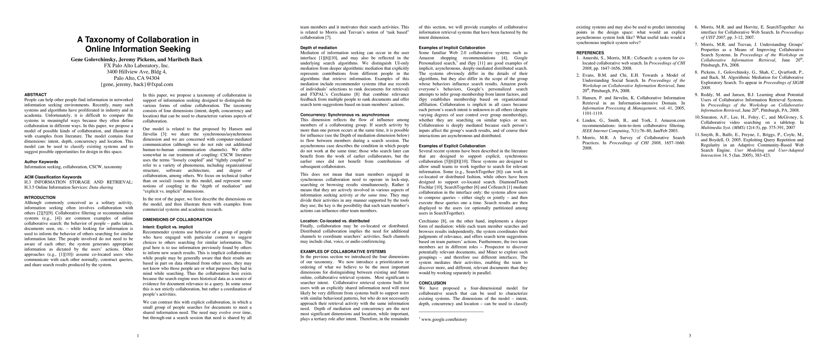 This paper proposes a taxonomy to categorize different forms of collaboration in online information seeking, featuring four dimensions: intent, depth, concurrency, and location. The model aims to standardize comparisons between systems and identify new design opportunities.