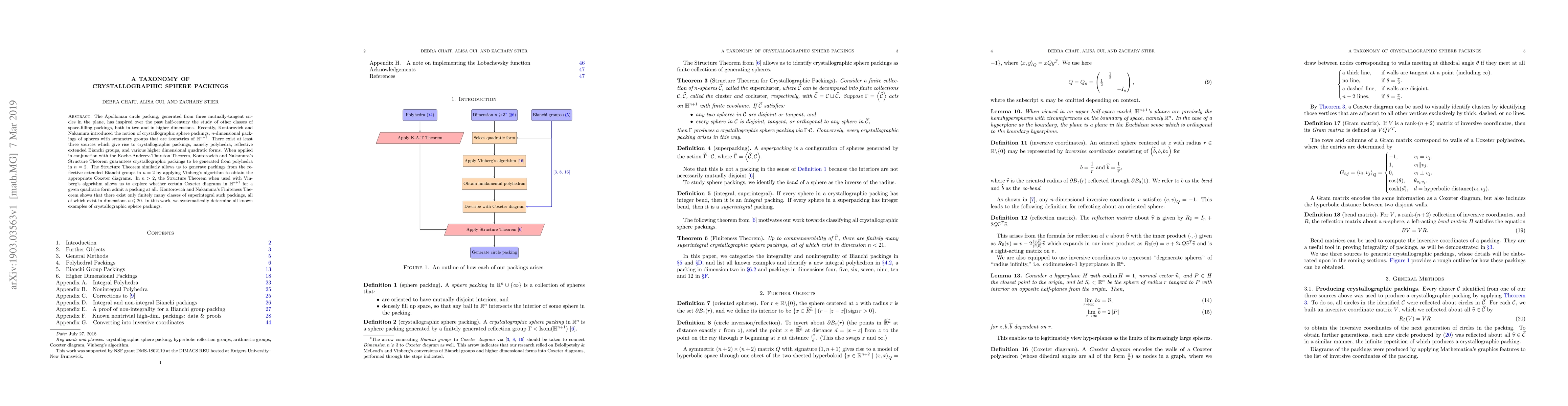 This paper systematically classifies crystallographic sphere packings, which are $n$-dimensional packings of spheres with symmetry groups acting as isometries of hyperbolic space. The authors explore their origins from polyhedra, reflective extended Bianchi groups, and higher-dimensional quadratic forms, and apply Kontorovich and Nakamura's Structure and Finiteness Theorems to determine all known examples up to dimension 20.
