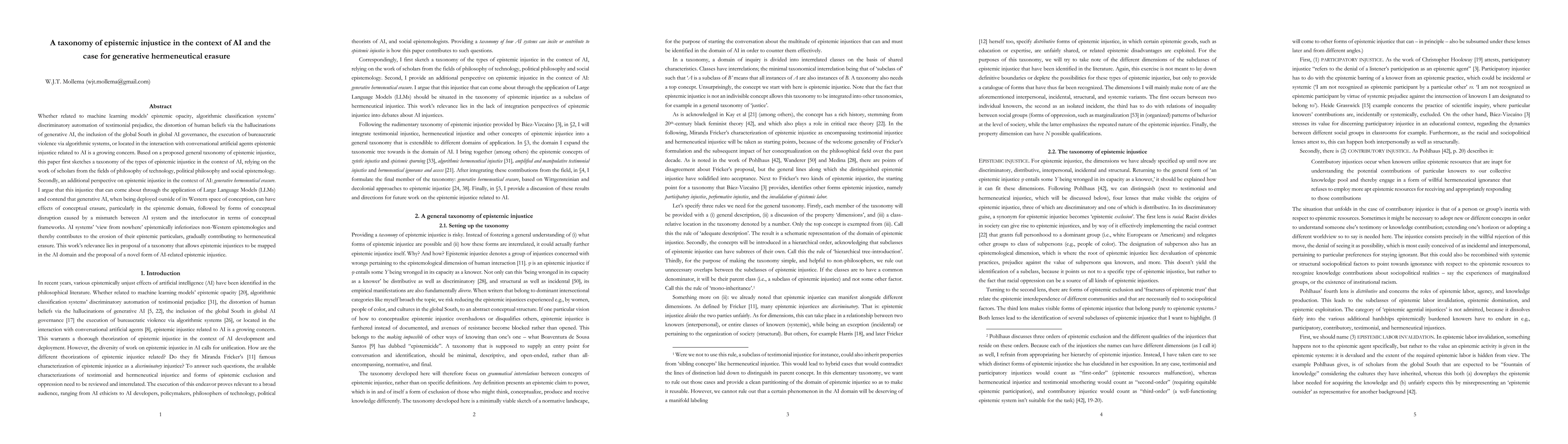 This paper proposes a taxonomy of epistemic injustice in the context of AI, including issues like algorithmic discrimination and the 'hallucinations' of generative AI. It introduces the concept of generative hermeneutical erasure, arguing that large language models can cause conceptual erasure and disruption when deployed outside their Western conceptual frameworks, thus inferiorizing non-Western epistemologies.