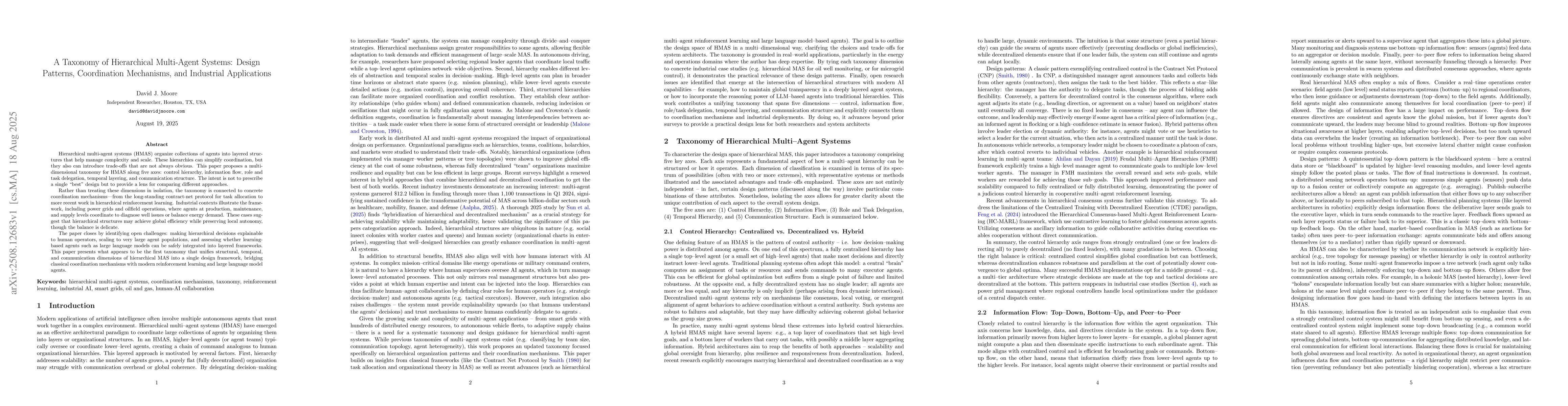 Hierarchical multi-agent systems (HMAS) organize collections of agents into layered structures that help manage complexity and scale. These hierarchies can simplify coordination, but they also can introduce trade-offs that are not always obvious. This paper proposes a multi-dimensional taxonomy for HMAS along five axes: control hierarchy, information flow, role and task delegation, temporal layering, and communication structure. The intent is not to prescribe a single "best" design but to provide a lens for comparing different approaches. Rather than treating these dimensions in isolation, the taxonomy is connected to concrete coordination mechanisms - from the long-standing contract-net protocol for task allocation to more recent work in hierarchical reinforcement learning. Industrial contexts illustrate the framework, including power grids and oilfield operations, where agents at production, maintenance, and supply levels coordinate to diagnose well issues or balance energy demand. These cases suggest that hierarchical structures may achieve global efficiency while preserving local autonomy, though the balance is delicate. The paper closes by identifying open challenges: making hierarchical decisions explainable to human operators, scaling to very large agent populations, and assessing whether learning-based agents such as large language models can be safely integrated into layered frameworks. This paper presents what appears to be the first taxonomy that unifies structural, temporal, and communication dimensions of hierarchical MAS into a single design framework, bridging classical coordination mechanisms with modern reinforcement learning and large language model agents.