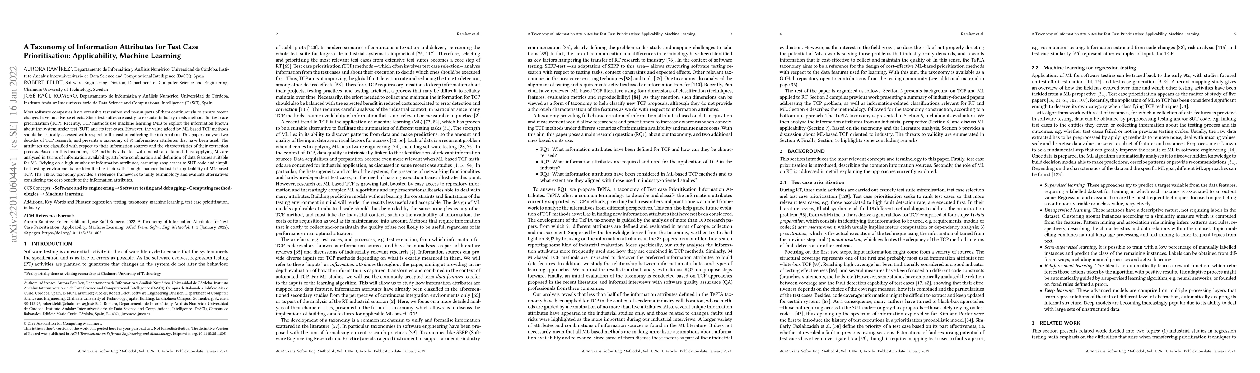Most software companies have extensive test suites and re-run parts of them continuously to ensure recent changes have no adverse effects. Since test suites are costly to execute, industry needs methods for test case prioritisation (TCP). Recently, TCP methods use machine learning (ML) to exploit the information known about the system under test (SUT) and its test cases. However, the value added by ML-based TCP methods should be critically assessed with respect to the cost of collecting the information. This paper analyses two decades of TCP research, and presents a taxonomy of 91 information attributes that have been used. The attributes are classified with respect to their information sources and the characteristics of their extraction process. Based on this taxonomy, TCP methods validated with industrial data and those applying ML are analysed in terms of information availability, attribute combination and definition of data features suitable for ML. Relying on a high number of information attributes, assuming easy access to SUT code and simplified testing environments are identified as factors that might hamper industrial applicability of ML-based TCP. The TePIA taxonomy provides a reference framework to unify terminology and evaluate alternatives considering the cost-benefit of the information attributes.