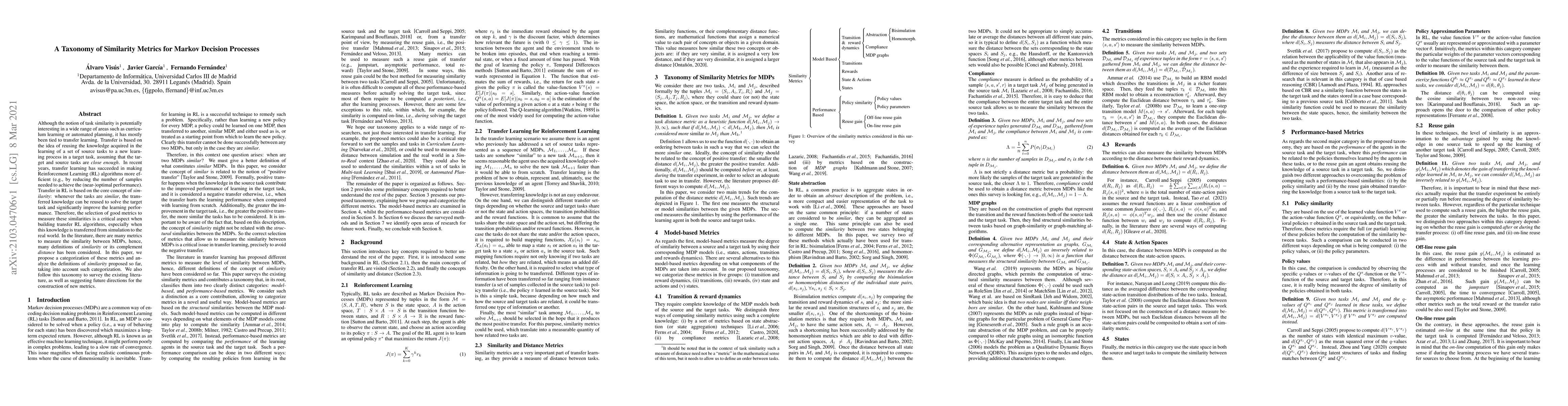 Although the notion of task similarity is potentially interesting in a wide range of areas such as curriculum learning or automated planning, it has mostly been tied to transfer learning. Transfer is based on the idea of reusing the knowledge acquired in the learning of a set of source tasks to a new learning process in a target task, assuming that the target and source tasks are close enough. In recent years, transfer learning has succeeded in making Reinforcement Learning (RL) algorithms more efficient (e.g., by reducing the number of samples needed to achieve the (near-)optimal performance). Transfer in RL is based on the core concept of similarity: whenever the tasks are similar, the transferred knowledge can be reused to solve the target task and significantly improve the learning performance. Therefore, the selection of good metrics to measure these similarities is a critical aspect when building transfer RL algorithms, especially when this knowledge is transferred from simulation to the real world. In the literature, there are many metrics to measure the similarity between MDPs, hence, many definitions of similarity or its complement distance have been considered. In this paper, we propose a categorization of these metrics and analyze the definitions of similarity proposed so far, taking into account such categorization. We also follow this taxonomy to survey the existing literature, as well as suggesting future directions for the construction of new metrics.