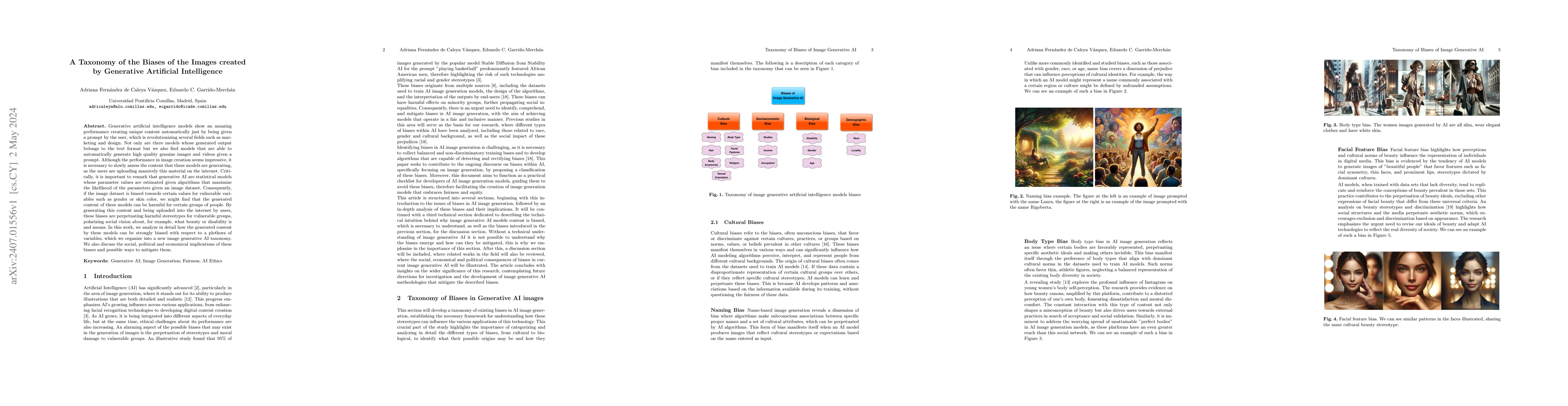 This paper presents a detailed taxonomy of biases in images generated by generative AI, emphasizing how these biases perpetuate harmful stereotypes and social stereotypes. It explores the social, political, and economic implications and proposes ways to mitigate these biases.