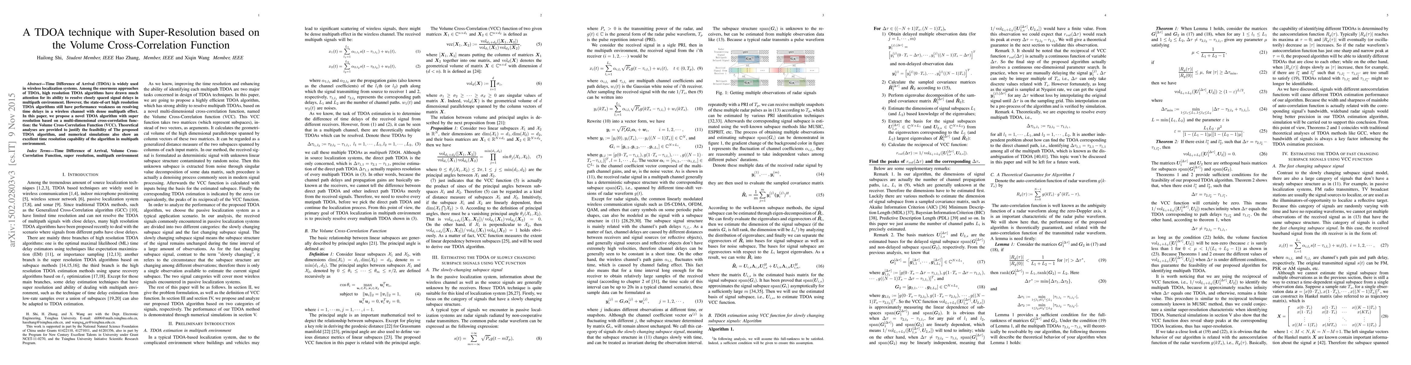 This paper proposes a novel TDOA algorithm using the Volume Cross-Correlation Function (VCC) for high-resolution localization in multipath environments. The method offers superior time resolution and lower computational complexity compared to existing algorithms, making it suitable for various passive wireless localization systems.