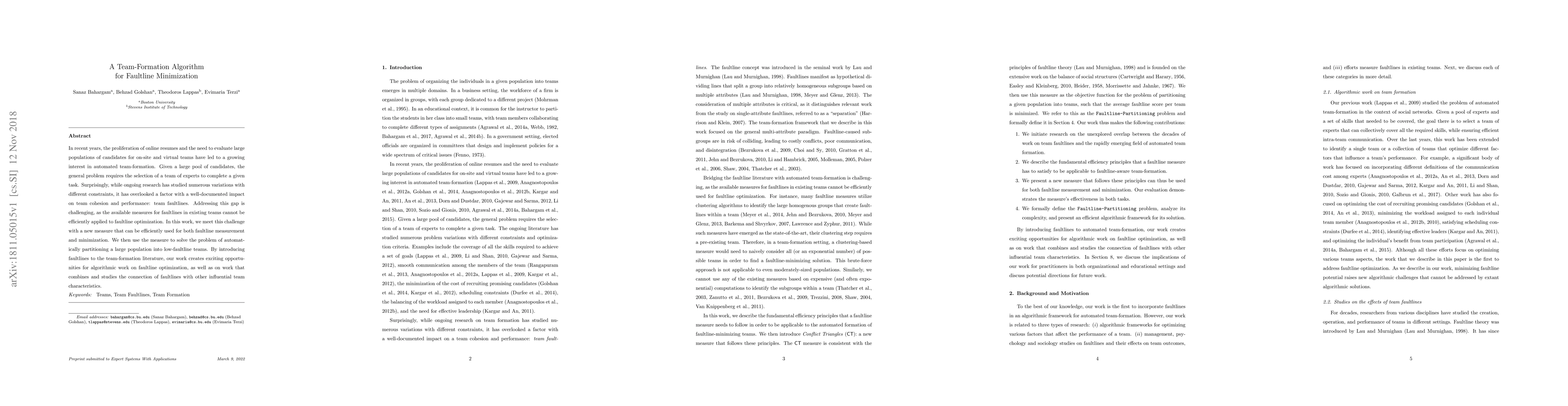 This paper introduces a novel algorithm for forming teams that minimizes faultlines, which are potential divisions within teams based on demographic attributes. The proposed measure efficiently assesses and reduces faultlines, offering new avenues for optimizing team cohesion and performance in automated team-formation processes.