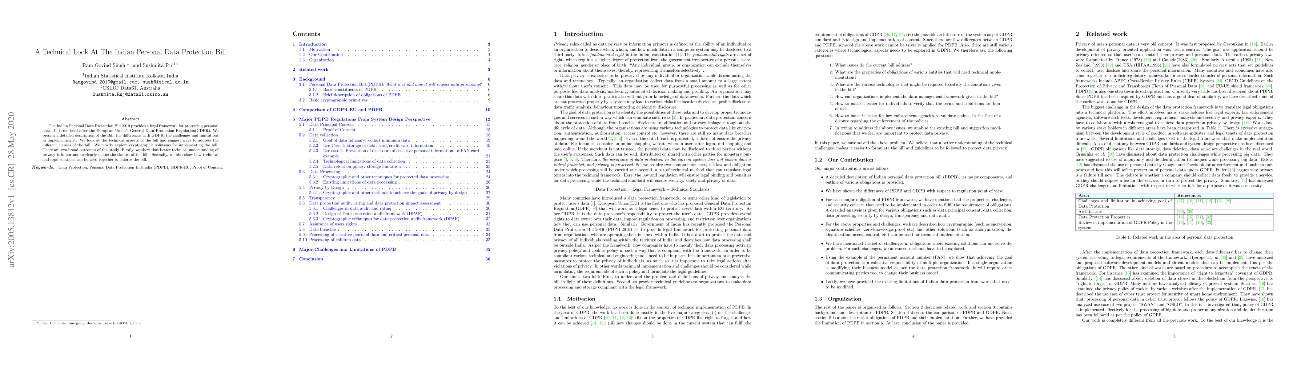 This paper examines the Indian Personal Data Protection Bill 2019, comparing it to the GDPR and highlighting its technical aspects and implementation challenges. It proposes cryptographic solutions to address the bill's clauses, emphasizing the importance of technical privacy understanding and the integration of technical and legal measures for effective enforcement.
