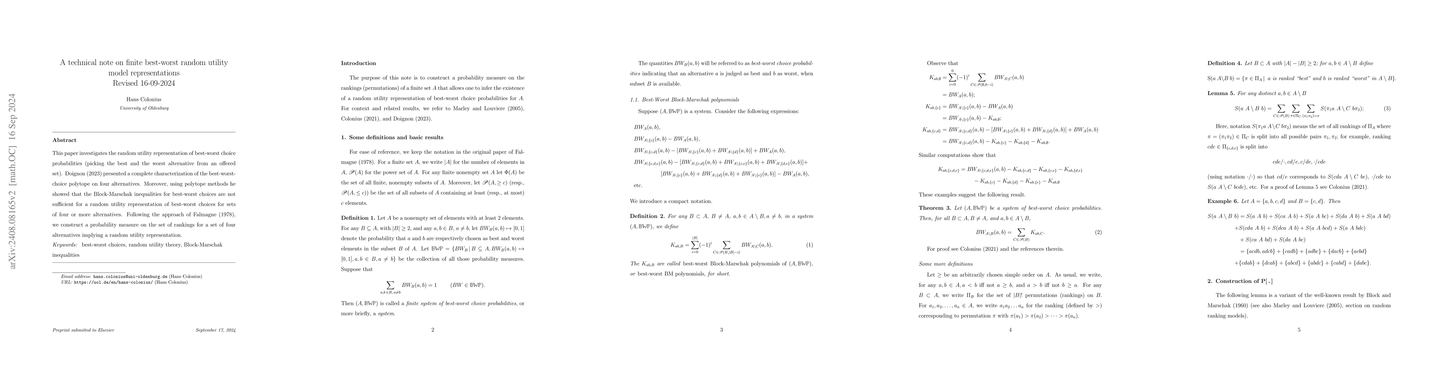 This paper constructs a probability measure on rankings for four alternatives to demonstrate a random utility representation for best-worst choice probabilities, countering Block-Marschak inequalities' sufficiency for larger sets. It builds on Doignon's characterization of the best-worst-choice polytope and Falmagne's earlier approach.