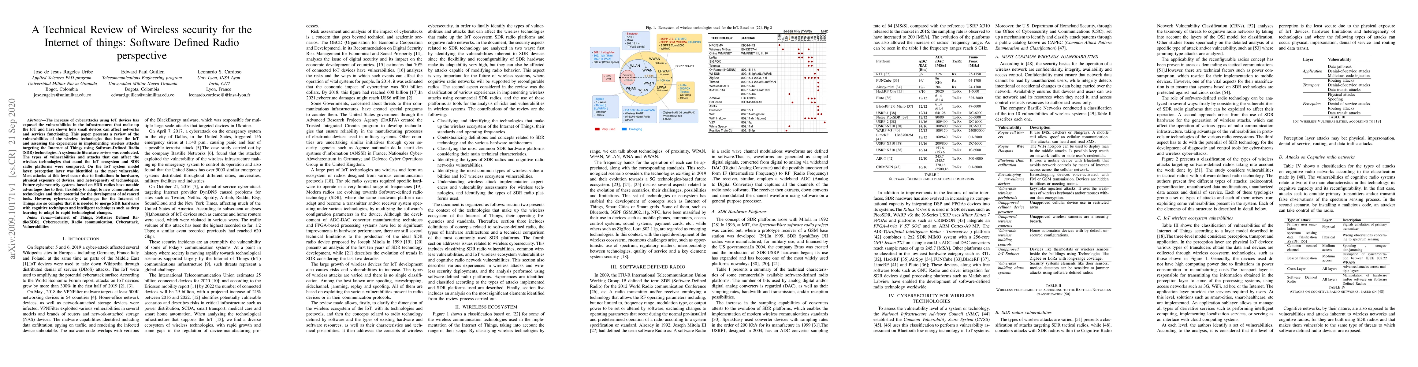 This paper reviews vulnerabilities in IoT wireless technologies and wireless attacks using Software-Defined Radio (SDR). It highlights the perception layer's susceptibility due to hardware limitations and physical exposure, and suggests that future cybersecurity systems leveraging SDR's flexibility must integrate cognitive and deep learning techniques to address complex IoT cybersecurity challenges.