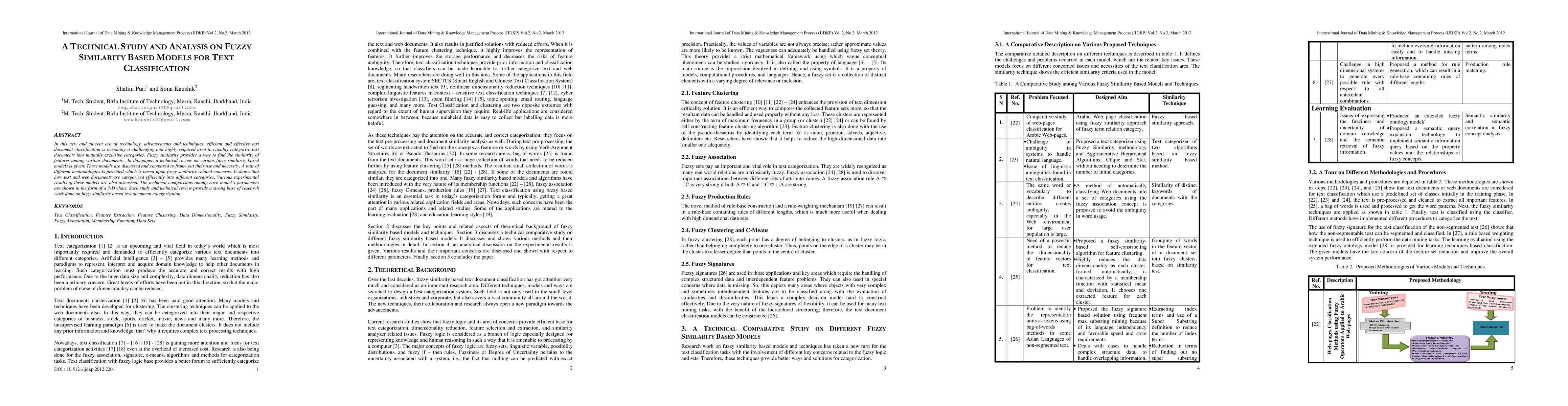 This paper reviews and compares various fuzzy similarity-based models for text classification, demonstrating their effectiveness in categorizing text and web documents. Experimental results and technical comparisons are presented in a 3-D chart, highlighting the models' parameters and their performance.
