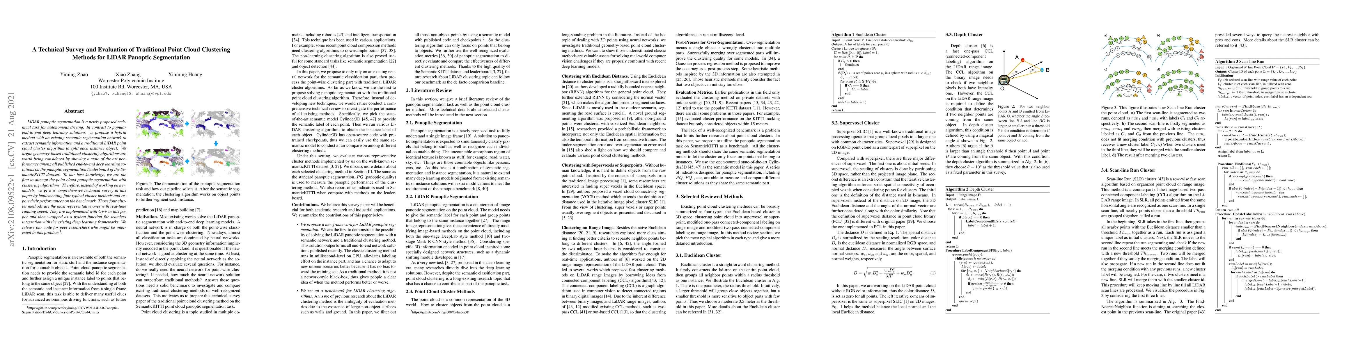 This paper conducts a technical survey and evaluation of traditional point cloud clustering methods for LiDAR panoptic segmentation, demonstrating state-of-the-art performance compared to end-to-end deep learning solutions. It implements and benchmarks four representative clustering algorithms, showing their effectiveness and real-time speed.