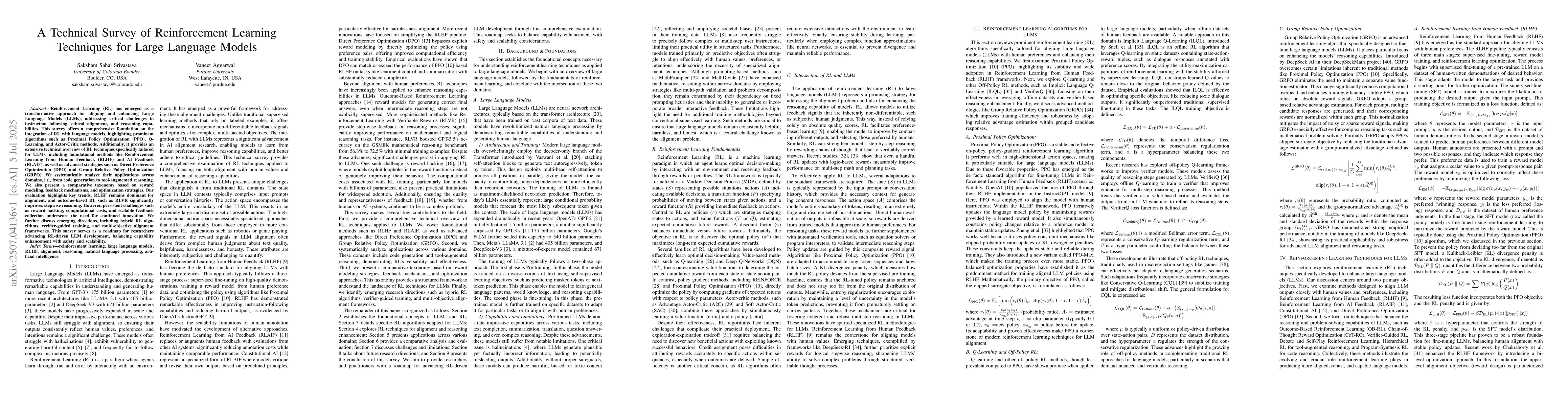 Reinforcement Learning (RL) has emerged as a transformative approach for aligning and enhancing Large Language Models (LLMs), addressing critical challenges in instruction following, ethical alignment, and reasoning capabilities. This survey offers a comprehensive foundation on the integration of RL with language models, highlighting prominent algorithms such as Proximal Policy Optimization (PPO), Q-Learning, and Actor-Critic methods. Additionally, it provides an extensive technical overview of RL techniques specifically tailored for LLMs, including foundational methods like Reinforcement Learning from Human Feedback (RLHF) and AI Feedback (RLAIF), as well as advanced strategies such as Direct Preference Optimization (DPO) and Group Relative Policy Optimization (GRPO). We systematically analyze their applications across domains, i.e., from code generation to tool-augmented reasoning. We also present a comparative taxonomy based on reward modeling, feedback mechanisms, and optimization strategies. Our evaluation highlights key trends. RLHF remains dominant for alignment, and outcome-based RL such as RLVR significantly improves stepwise reasoning. However, persistent challenges such as reward hacking, computational costs, and scalable feedback collection underscore the need for continued innovation. We further discuss emerging directions, including hybrid RL algorithms, verifier-guided training, and multi-objective alignment frameworks. This survey serves as a roadmap for researchers advancing RL-driven LLM development, balancing capability enhancement with safety and scalability.