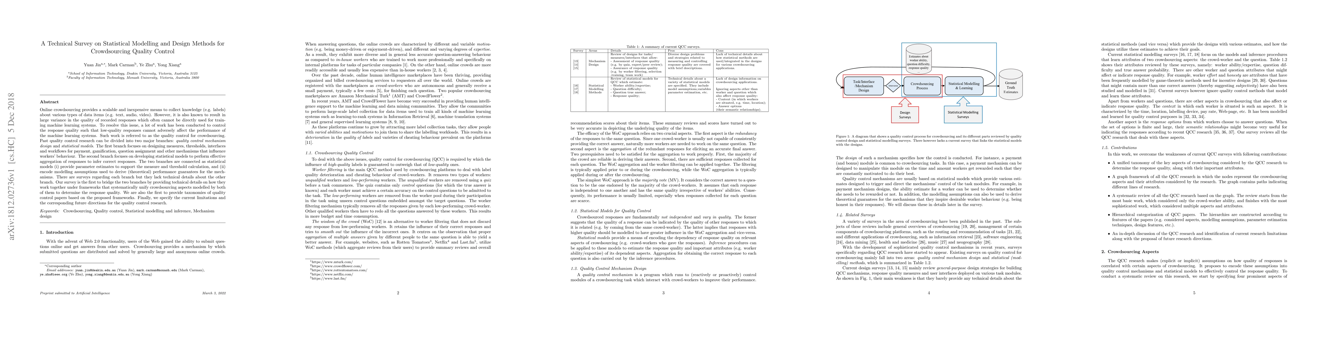 Online crowdsourcing provides a scalable and inexpensive means to collect knowledge (e.g. labels) about various types of data items (e.g. text, audio, video). However, it is also known to result in large variance in the quality of recorded responses which often cannot be directly used for training machine learning systems. To resolve this issue, a lot of work has been conducted to control the response quality such that low-quality responses cannot adversely affect the performance of the machine learning systems. Such work is referred to as the quality control for crowdsourcing. Past quality control research can be divided into two major branches: quality control mechanism design and statistical models. The first branch focuses on designing measures, thresholds, interfaces and workflows for payment, gamification, question assignment and other mechanisms that influence workers' behaviour. The second branch focuses on developing statistical models to perform effective aggregation of responses to infer correct responses. The two branches are connected as statistical models (i) provide parameter estimates to support the measure and threshold calculation, and (ii) encode modelling assumptions used to derive (theoretical) performance guarantees for the mechanisms. There are surveys regarding each branch but they lack technical details about the other branch. Our survey is the first to bridge the two branches by providing technical details on how they work together under frameworks that systematically unify crowdsourcing aspects modelled by both of them to determine the response quality. We are also the first to provide taxonomies of quality control papers based on the proposed frameworks. Finally, we specify the current limitations and the corresponding future directions for the quality control research.