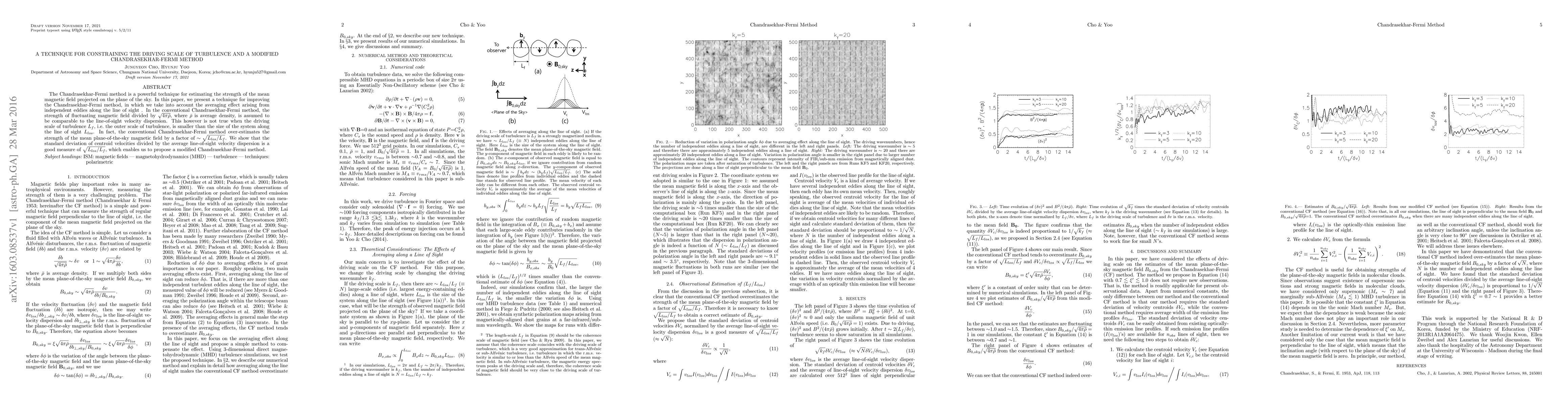The Chandrasekhar-Fermi method is a powerful technique for estimating the strength of the mean magnetic field projected on the plane of the sky. In this paper, we present a technique for improving the Chandrasekhar-Fermi method, in which we take into account the averaging effect arising from independent eddies along the line of sight . In the conventional Chandrasekhar-Fermi method, the strength of fluctuating magnetic field divided by $\sqrt{4 \pi \bar{\rho}}$, where $\bar{\rho}$ is average density, is assumed to be comparable to the line-of-sight velocity dispersion. This however is not true when the driving scale of turbulence $L_f$, i.e. the outer scale of turbulence, is smaller than the size of the system along the line of sight $L_{los}$. In fact, the conventional Chandrasekhar-Fermi method over-estimates the strength of the mean plane-of-the-sky magnetic field by a factor of $\sim \sqrt{ L_{los}/L_f}$. We show that the standard deviation of centroid velocities divided by the average line-of-sight velocity dispersion is a good measure of $\sqrt{ L_{los}/L_f}$, which enables us to propose a modified Chandrasekhar-Fermi method.