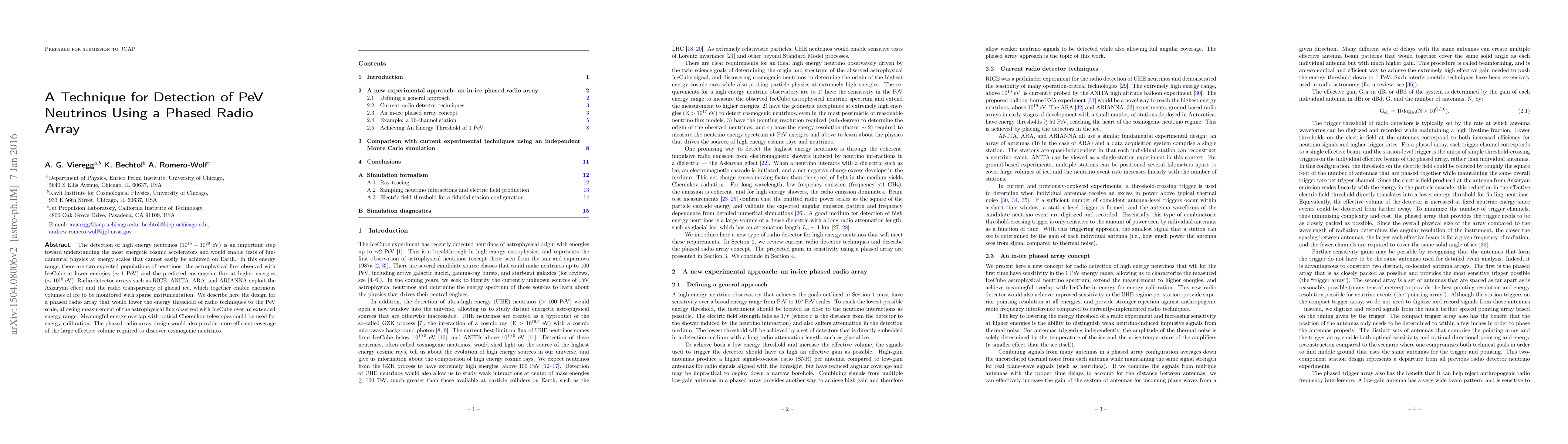 This paper proposes a phased radio array technique to detect PeV energy neutrinos, leveraging the Askaryan effect to monitor vast ice volumes. The design aims to extend the detection range to cover both astrophysical and cosmogenic neutrino fluxes, facilitating fundamental physics tests and enhancing the search for high-energy cosmic accelerators.