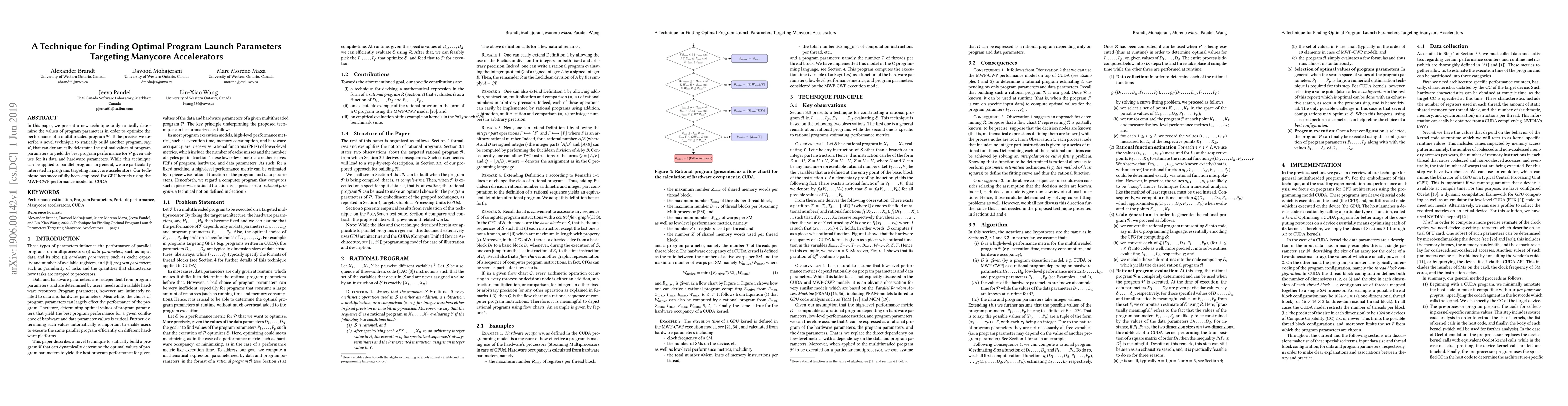 In this paper, we present a new technique to dynamically determine the values of program parameters in order to optimize the performance of a multithreaded program P. To be precise, we describe a novel technique to statically build another program, say, R, that can dynamically determine the optimal values of program parameters to yield the best program performance for P given values for its data and hardware parameters. While this technique can be applied to parallel programs in general, we are particularly interested in programs targeting manycore accelerators. Our technique has successfully been employed for GPU kernels using the MWP-CWP performance model for CUDA.