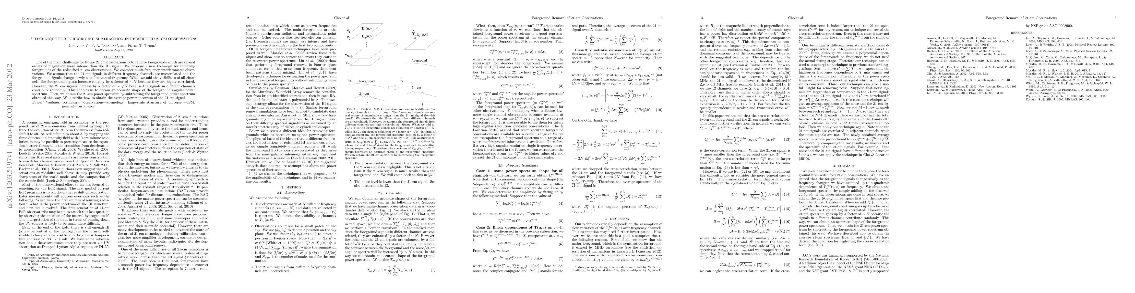 This paper proposes a new technique for removing foregrounds from redshifted 21 cm observations, leveraging multi-frequency interferometer data. By exploiting the uncorrelated nature of 21 cm signals across channels and the slow frequency variation of foregrounds, the method effectively separates and subtracts foregrounds, enabling accurate extraction of the 21 cm signal power spectrum.