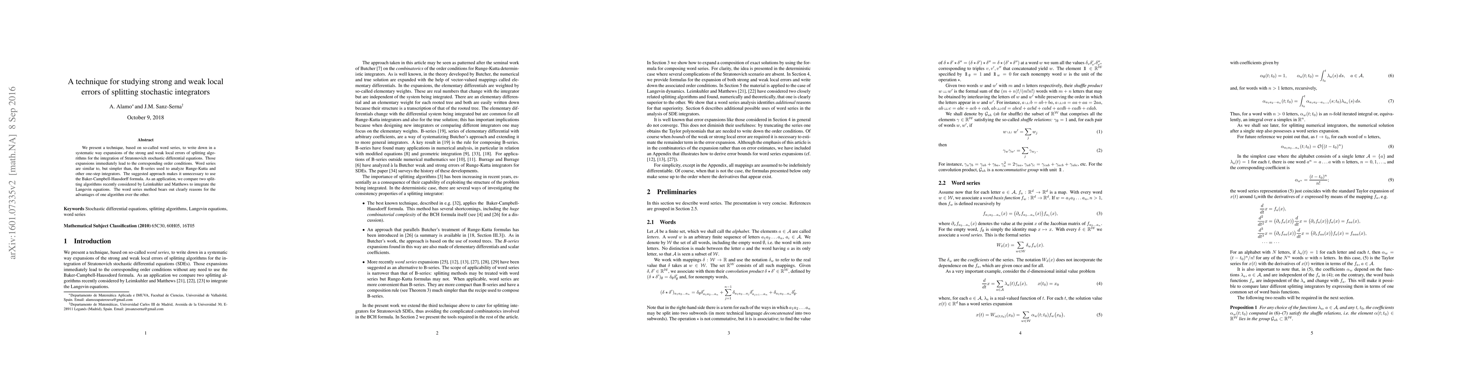 We present a technique, based on so-called word series, to write down in a systematic way expansions of the strong and weak local errors of splitting algorithms for the integration of Stratonovich stochastic differential equations. Those expansions immediately lead to the corresponding order conditions. Word series are similar to, but simpler than, the B-series used to analyze Runge-Kutta and other one-step integrators. The suggested approach makes it unnecessary to use the Baker-Campbell-Hausdorff formula. As an application, we compare two splitting algorithms recently considered by Leimkuhler and Matthews to integrate the Langevin equations. The word series method bears out clearly reasons for the advantages of one algorithm over the other.