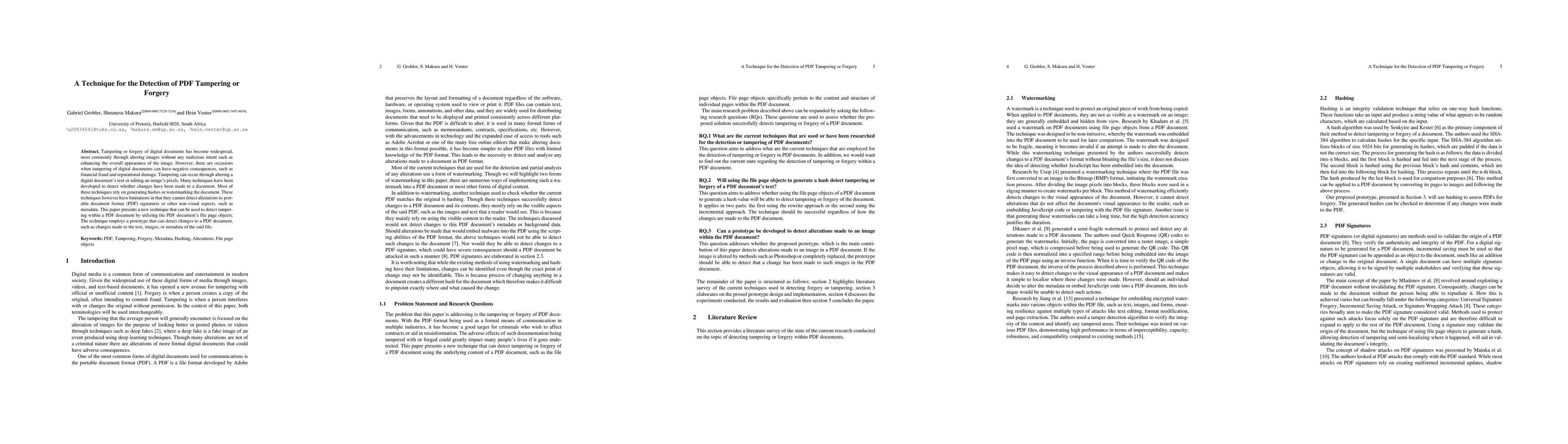 Tampering or forgery of digital documents has become widespread, most commonly through altering images without any malicious intent such as enhancing the overall appearance of the image. However, there are occasions when tampering of digital documents can have negative consequences, such as financial fraud and reputational damage. Tampering can occur through altering a digital document's text or editing an image's pixels. Many techniques have been developed to detect whether changes have been made to a document. Most of these techniques rely on generating hashes or watermarking the document. These techniques, however, have limitations in that they cannot detect alterations to portable document format (PDF) signatures or other non-visual aspects, such as metadata. This paper presents a new technique that can be used to detect tampering within a PDF document by utilizing the PDF document's file page objects. The technique employs a prototype that can detect changes to a PDF document, such as changes made to the text, images, or metadata of the said file.