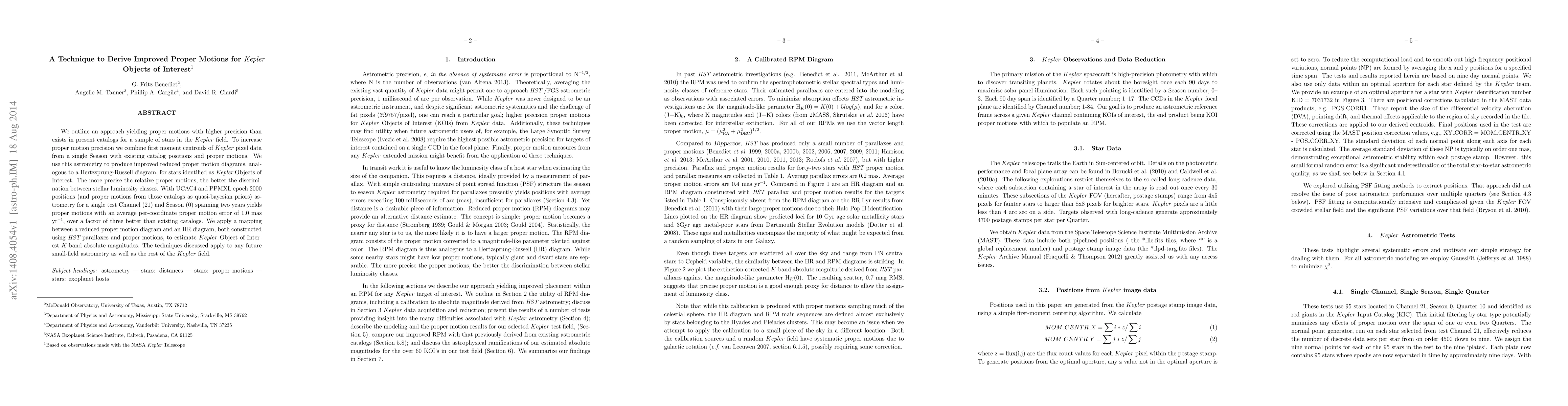 We outline an approach yielding proper motions with higher precision than exists in present catalogs for a sample of stars in the Kepler field. To increase proper motion precision we combine first moment centroids of Kepler pixel data from a single Season with existing catalog positions and proper motions. We use this astrometry to produce improved reduced proper motion diagrams, analogous to a Hertzsprung-Russell diagram, for stars identified as Kepler Objects of Interest. The more precise the relative proper motions, the better the discrimination between stellar luminosity classes. With UCAC4 and PPMXL epoch 2000 positions (and proper motions from those catalogs as quasi-bayesian priors) astrometry for a single test Channel (21) and Season (0) spanning two years yields proper motions with an average per-coordinate proper motion error of 1.0 millisecond of arc per year, over a factor of three better than existing catalogs. We apply a mapping between a reduced proper motion diagram and an HR diagram, both constructed using HST parallaxes and proper motions, to estimate Kepler Object of Interest K-band absolute magnitudes. The techniques discussed apply to any future small-field astrometry as well as the rest of the Kepler field.