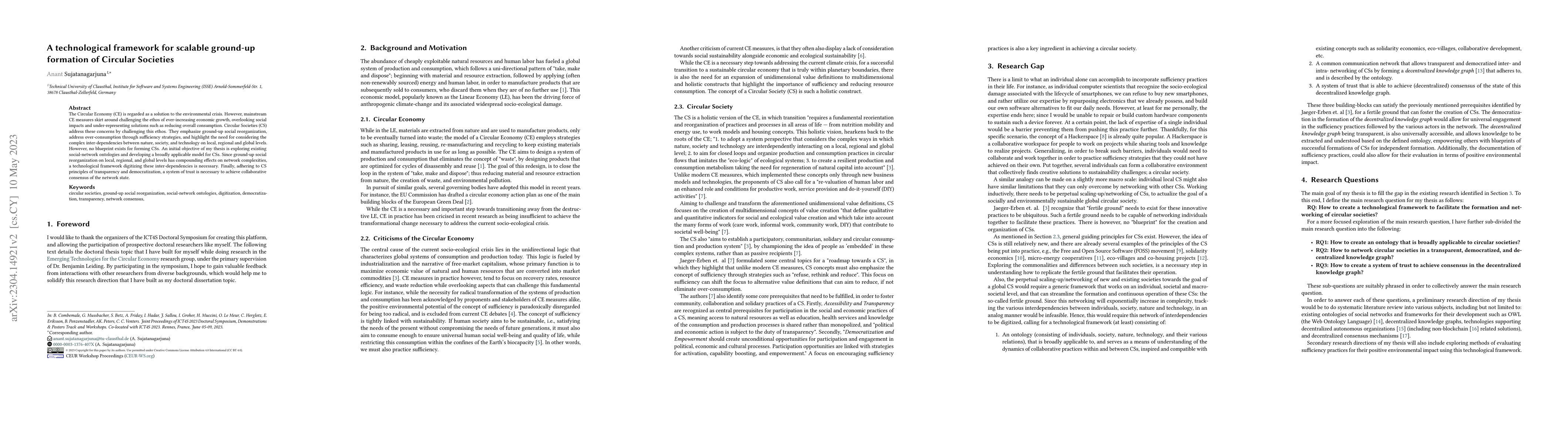 The Circular Economy (CE) is regarded as a solution to the environmental crisis. However, mainstream CE measures skirt around challenging the ethos of ever-increasing economic growth, overlooking social impacts and under-representing solutions such as reducing overall consumption. Circular Societies (CS) address these concerns by challenging this ethos. They emphasize ground-up social reorganization,address over-consumption through sufficiency strategies, and highlight the need for considering the complex inter-dependencies between nature, society, and technology on local, regional and global levels. However, no blueprint exists for forming CSs. An initial objective of my thesis is exploring existing social-network ontologies and developing a broadly applicable model for CSs. Since ground-up social reorganization on local, regional, and global levels has compounding effects on network complexities,a technological framework digitizing these inter-dependencies is necessary. Finally, adhering to CS principles of transparency and democratization, a system of trust is necessary to achieve collaborative consensus of the network state.