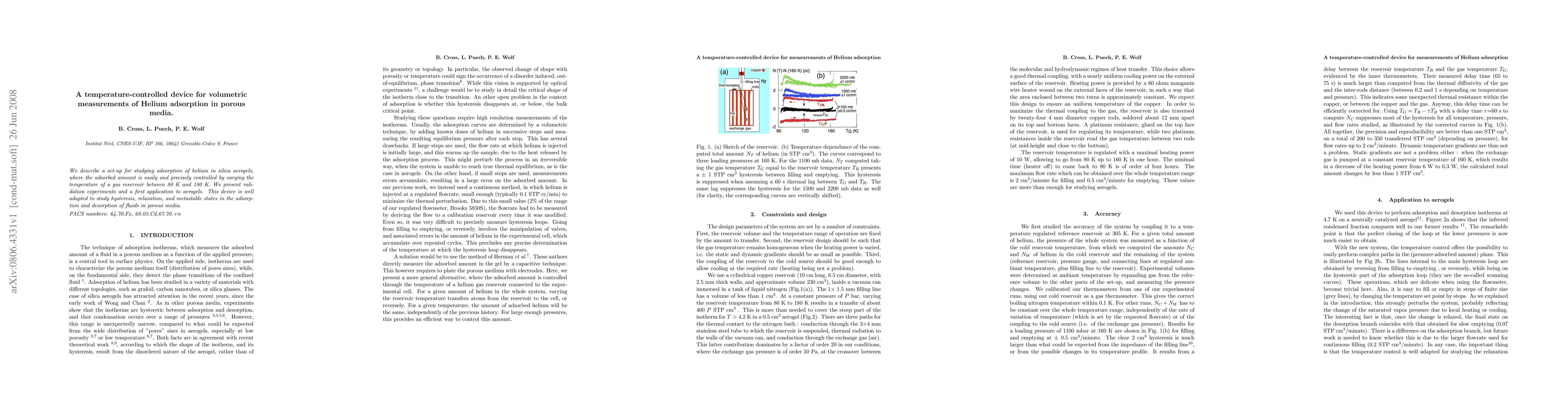 This paper details a temperature-controlled device for precise volumetric measurements of helium adsorption in silica aerogels, validated through experiments and applied to study adsorption hysteresis and metastable states. The device allows for temperature-controlled adsorption between 80 K and 180 K.