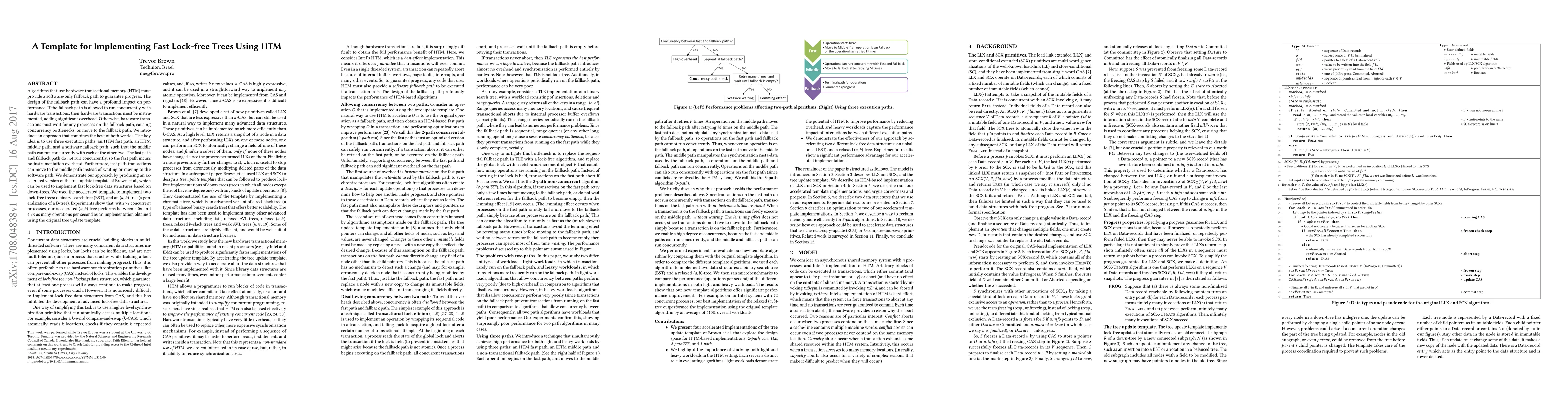 This paper proposes a template for implementing fast lock-free trees using hardware transactional memory (HTM) by introducing three execution paths: an HTM fast path, an HTM middle path, and a software fallback path. The middle path runs concurrently with both the fast and fallback paths, minimizing overhead and concurrency bottlenecks. Experiments show that the accelerated (a,b)-tree implementation achieves up to 4.2x more operations per second compared to the original template.