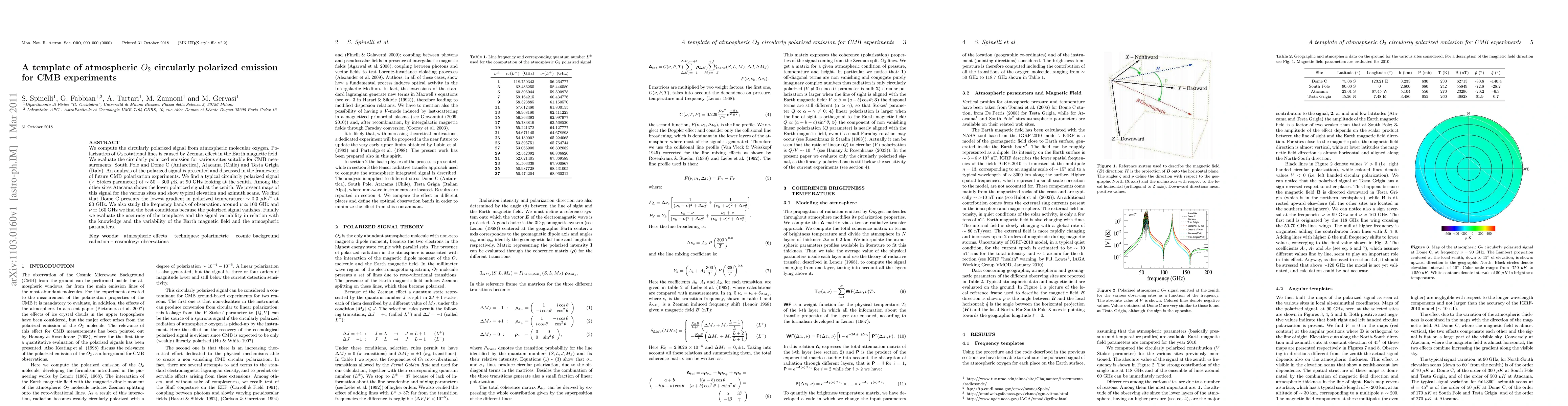 We compute the circularly polarized signal from atmospheric molecular oxygen. Polarization of O2 rotational lines is caused by Zeeman effect in the Earth magnetic field. We evaluate the circularly polarized emission for various sites suitable for CMB measurements: South Pole and Dome C (Antarctica), Atacama (Chile) and Testa Grigia (Italy). An analysis of the polarized signal is presented and discussed in the framework of future CMB polarization experiments. We find a typical circularly polarized signal (V Stokes parameter) of ~ 50 - 300 {\mu}K at 90 GHz looking at the zenith. Among the other sites Atacama shows the lower polarized signal at the zenith. We present maps of this signal for the various sites and show typical elevation and azimuth scans. We find that Dome C presents the lowest gradient in polarized temperature: ~ 0.3 {\mu}K/\circ at 90 GHz. We also study the frequency bands of observation: around {\nu} \simeq 100 GHz and {\nu} \simeq 160 GHz we find the best conditions because the polarized signal vanishes. Finally we evaluate the accuracy of the templates and the signal variability in relation with the knowledge and the variability of the Earth magnetic field and the atmospheric parameters.