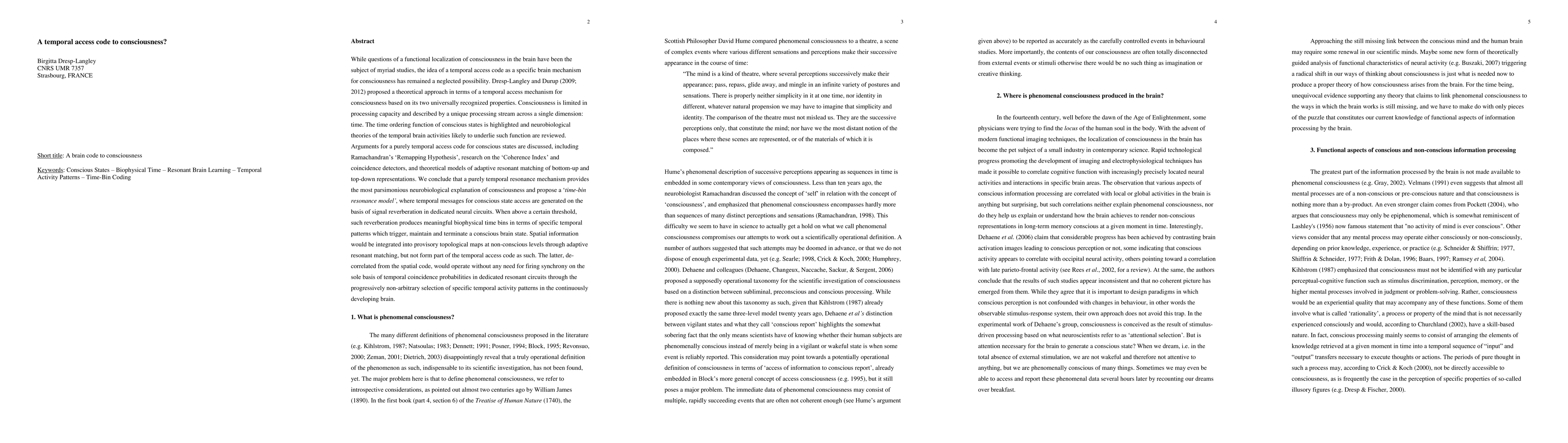While questions of a functional localization of consciousness in the brain have been the subject of myriad studies, the idea of a temporal access code as a specific brain mechanism for consciousness has remained a neglected possibility. Dresp-Langley and Durup (2009, 2012) proposed a theoretical approach in terms of a temporal access mechanism for consciousness based on its two universally recognized properties. Consciousness is limited in processing capacity and described by a unique processing stream across a single dimension, which is time. The time ordering function of conscious states is highlighted and neurobiological theories of the temporal brain activities likely to underlie such function are discussed, and the properties of the code model are then introduced. Spatial information is integrated into provisory topological maps at non-conscious levels through adaptive resonant matching, but does not form part of the temporal access code as such. The latter, de-correlated from the spatial code, operates without any need for firing synchrony on the sole basis of temporal coincidence probabilities in dedicated resonant circuits through progressively non-arbitrary selection of specific temporal activity patterns in the continuously developing brain.