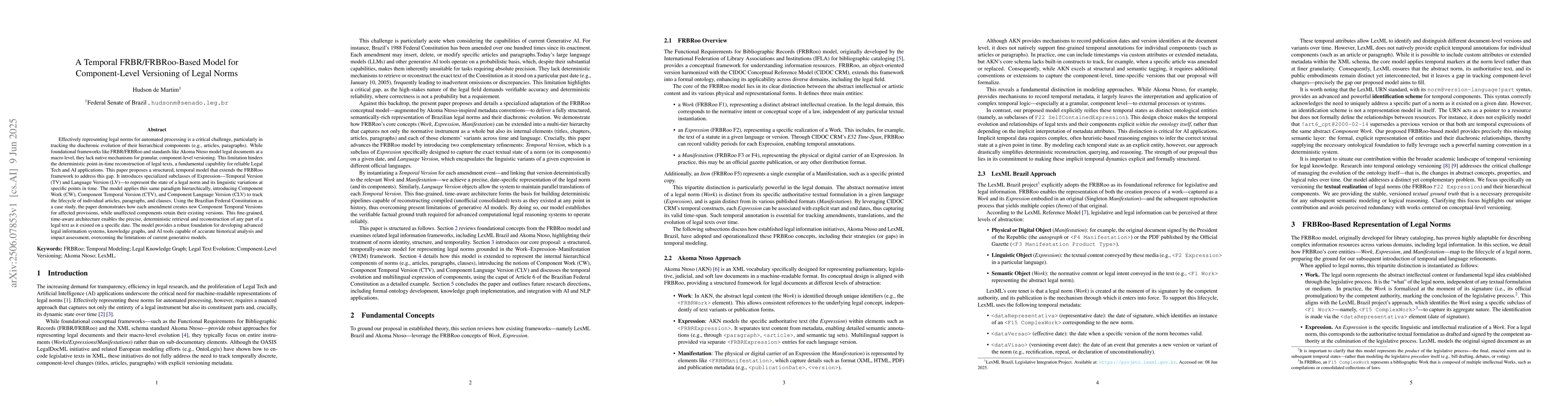 Effectively representing legal norms for automated processing is a critical challenge, particularly in tracking the diachronic evolution of their hierarchical components (e.g., articles, paragraphs). While foundational frameworks like FRBR/FRBRoo and standards like Akoma Ntoso model legal documents at a macro level, they lack native mechanisms for granular, component-level versioning. This limitation hinders the deterministic point-in-time reconstruction of legal texts, a fundamental capability for reliable Legal Tech and AI applications. This paper proposes a structured, temporal model that extends the FRBRoo framework to address this gap. It introduces specialized subclasses of Expressio - Temporal Version (TV) and Language Version (LV - to represent the state of a legal norm and its linguistic variations at specific points in time. The model applies this same paradigm hierarchically, introducing Component Work (CW), Component Temporal Version (CTV), and Component Language Version (CLV) to track the lifecycle of individual articles, paragraphs, and clauses. Using the Brazilian Federal Constitution as a case study, the paper demonstrates how each amendment creates new Component Temporal Versions for affected provisions, while unaffected components retain their existing versions. This fine-grained, time-aware architecture enables the precise, deterministic retrieval and reconstruction of any part of a legal text as it existed on a specific date. The model provides a robust foundation for developing advanced legal information systems, knowledge graphs, and AI tools capable of accurate historical analysis and impact assessment, overcoming the limitations of current generative models.