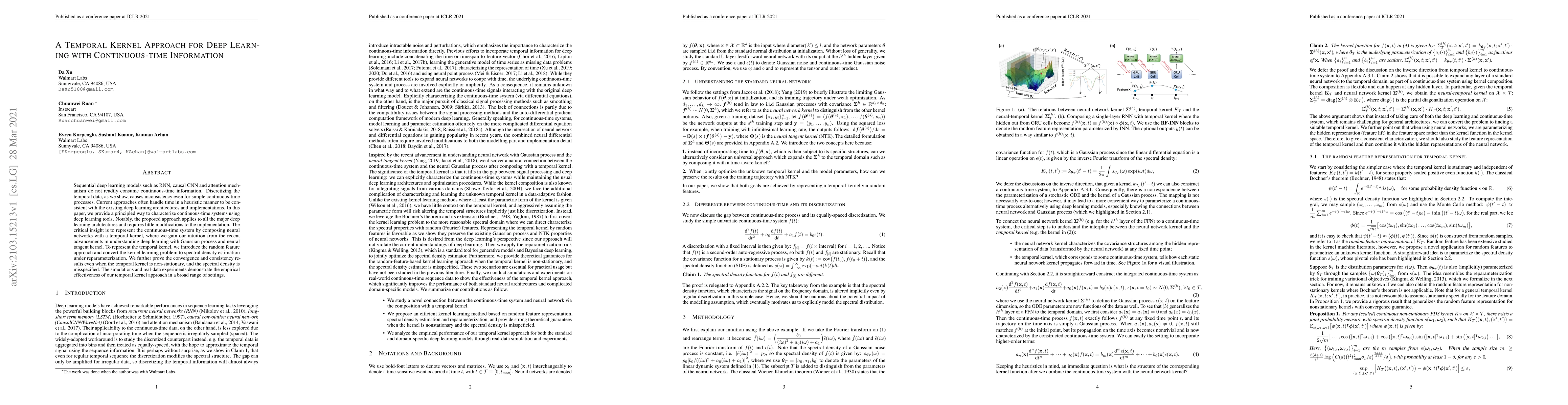 Sequential deep learning models such as RNN, causal CNN and attention mechanism do not readily consume continuous-time information. Discretizing the temporal data, as we show, causes inconsistency even for simple continuous-time processes. Current approaches often handle time in a heuristic manner to be consistent with the existing deep learning architectures and implementations. In this paper, we provide a principled way to characterize continuous-time systems using deep learning tools. Notably, the proposed approach applies to all the major deep learning architectures and requires little modifications to the implementation. The critical insight is to represent the continuous-time system by composing neural networks with a temporal kernel, where we gain our intuition from the recent advancements in understanding deep learning with Gaussian process and neural tangent kernel. To represent the temporal kernel, we introduce the random feature approach and convert the kernel learning problem to spectral density estimation under reparameterization. We further prove the convergence and consistency results even when the temporal kernel is non-stationary, and the spectral density is misspecified. The simulations and real-data experiments demonstrate the empirical effectiveness of our temporal kernel approach in a broad range of settings.