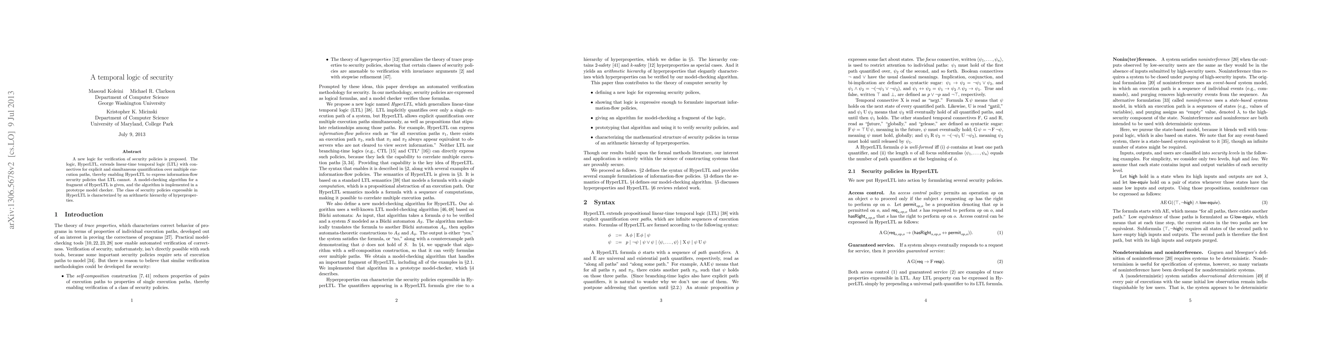 This paper proposes HyperLTL, an extension of linear-time temporal logic (LTL) with additional connectives for quantifying over multiple execution paths, enabling it to express complex information-flow security policies. A model-checking algorithm for a subset of HyperLTL is developed and implemented in a prototype model checker.