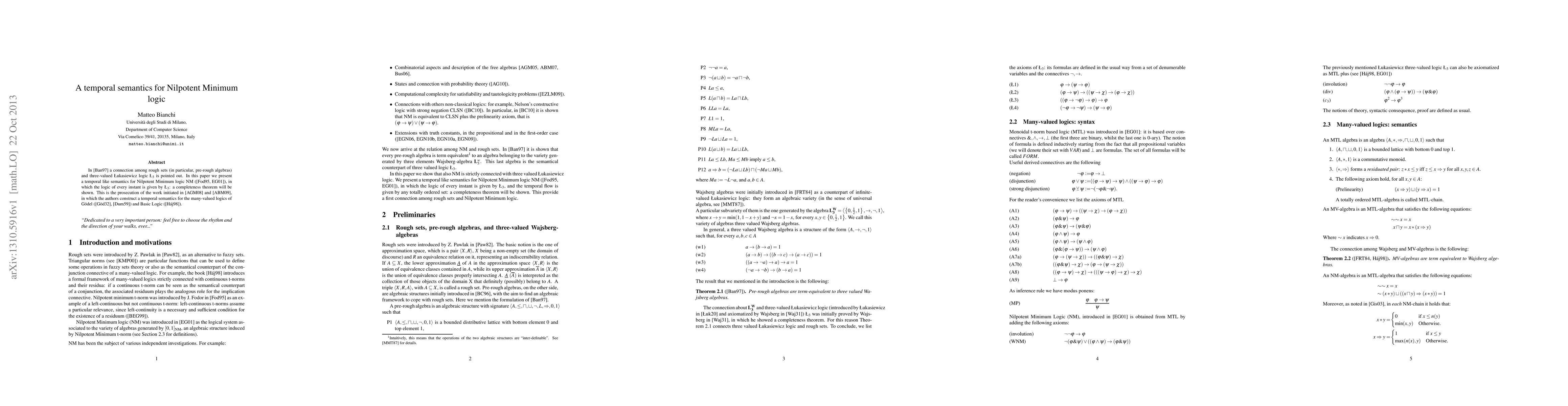 In [Ban97] a connection among rough sets (in particular, pre-rough algebras) and three-valued {\L}ukasiewicz logic {\L}3 is pointed out. In this paper we present a temporal like semantics for Nilpotent Minimum logic NM ([Fod95, EG01]), in which the logic of every instant is given by {\L}3: a completeness theorem will be shown. This is the prosecution of the work initiated in [AGM08] and [ABM09], in which the authors construct a temporal semantics for the many-valued logics of G\"odel ([G\"od32], [Dum59]) and Basic Logic ([H\'aj98]).