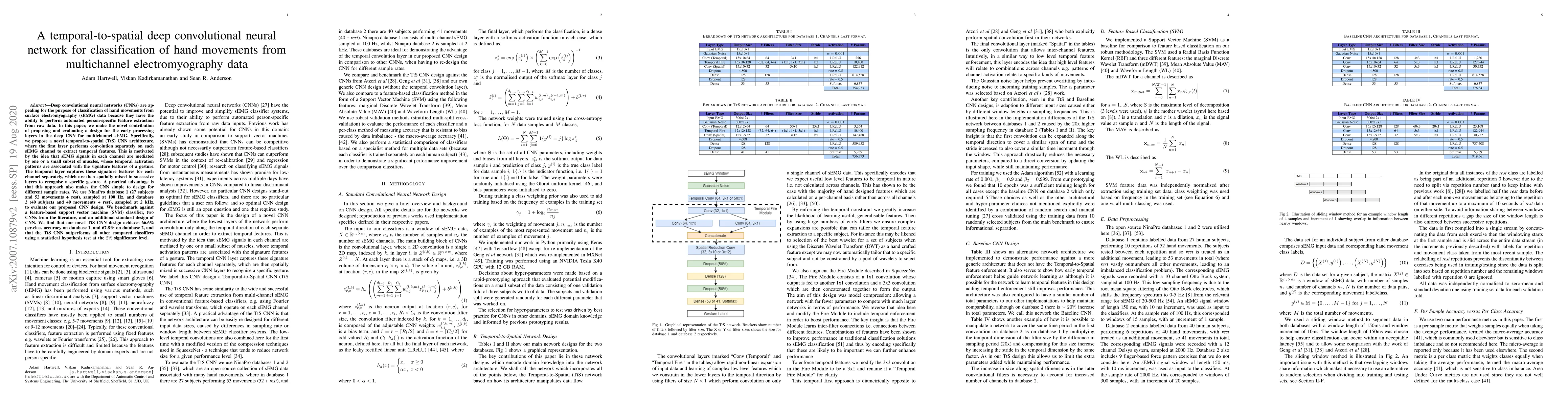 This paper proposes a novel temporal-to-spatial deep convolutional neural network (CNN) architecture for classifying hand movements from multichannel electromyography (sEMG) data. The TtS CNN extracts temporal features from each sEMG channel separately before combining them, achieving superior performance over other classifiers, with 66.6% accuracy on database 1 and 67.8% on database 2.