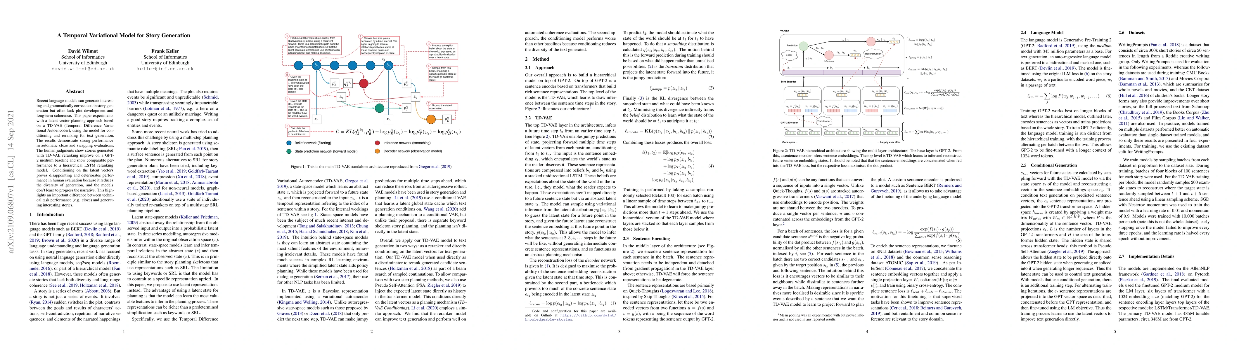 This paper proposes a TD-VAE-based model for story generation that enhances plot development and coherence, showing strong performance in automatic evaluations and human judgments compared to a GPT-2 baseline. However, conditioning on latent vectors reduces narrative diversity and fails to improve story progression.