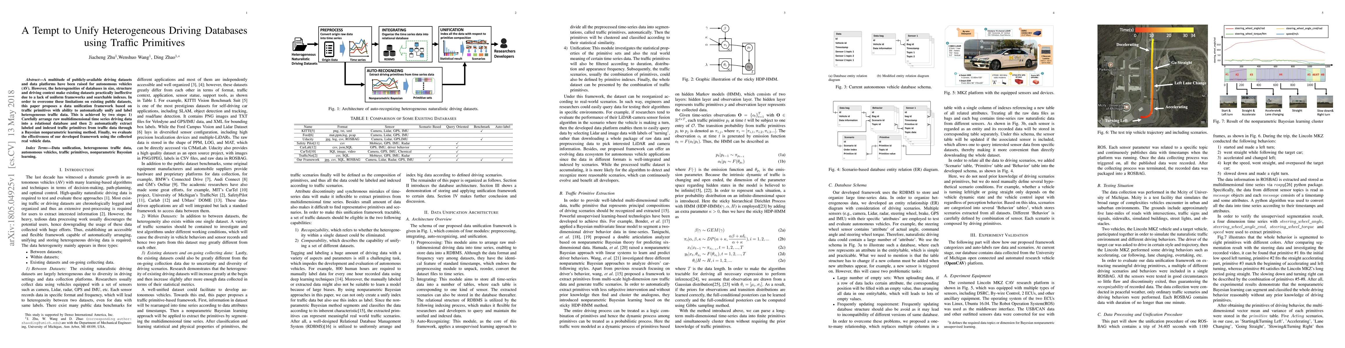 This paper proposes a framework to unify heterogeneous driving datasets by organizing raw data into a relational database and extracting labeled traffic primitives using Bayesian nonparametric learning, aiming to improve the usability of existing public datasets for autonomous vehicles. The effectiveness of the framework is evaluated using real vehicle data.