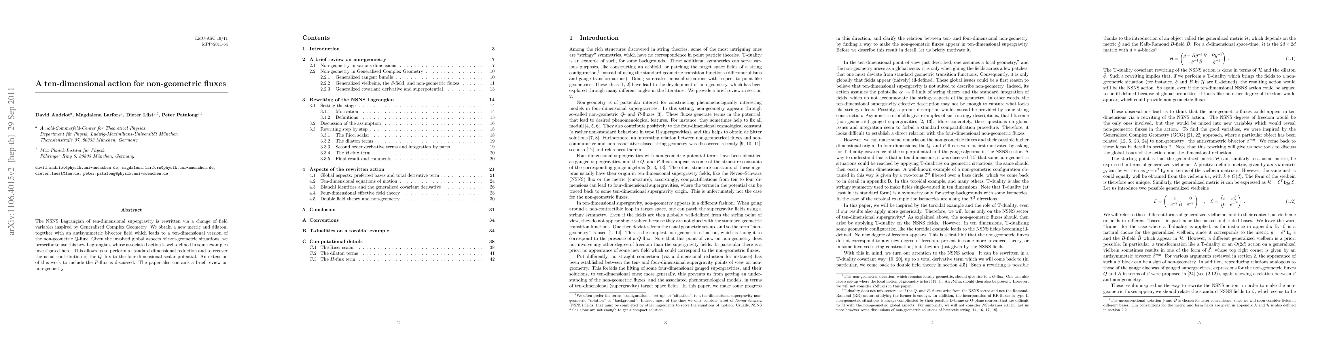 The NSNS Lagrangian of ten-dimensional supergravity is rewritten via a change of field variables inspired by Generalized Complex Geometry. We obtain a new metric and dilaton, together with an antisymmetric bivector field which leads to a ten-dimensional version of the non-geometric Q-flux. Given the involved global aspects of non-geometric situations, we prescribe to use this new Lagrangian, whose associated action is well-defined in some examples investigated here. This allows us to perform a standard dimensional reduction and to recover the usual contribution of the Q-flux to the four-dimensional scalar potential. An extension of this work to include the R-flux is discussed. The paper also contains a brief review on non-geometry.