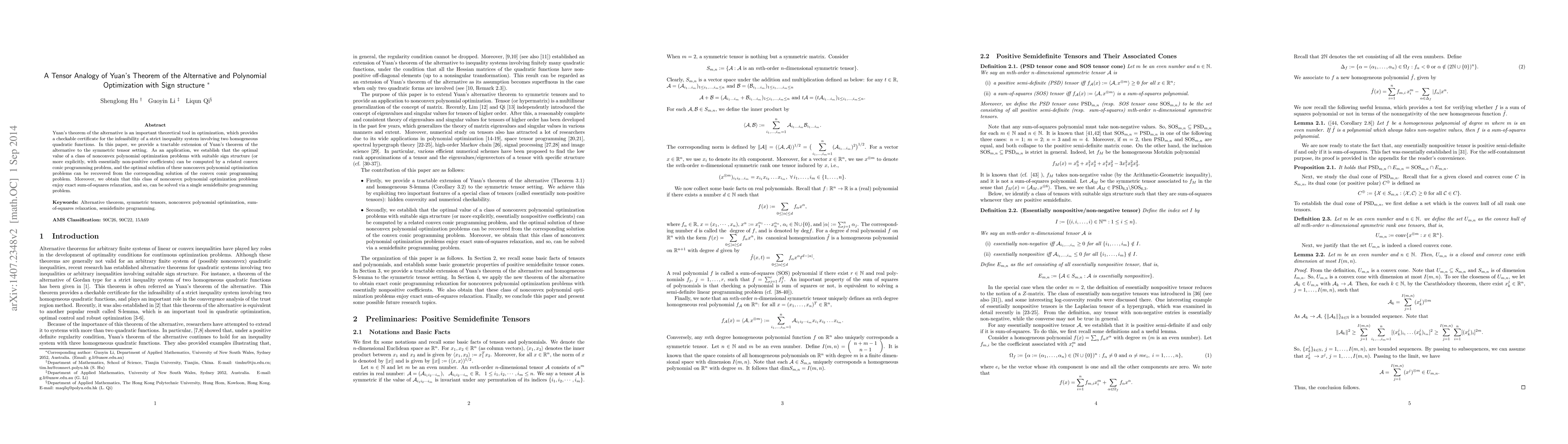 Yuan's theorem of the alternative is an important theoretical tool in optimization, which provides a checkable certificate for the infeasibility of a strict inequality system involving two homogeneous quadratic functions. In this paper, we provide a tractable extension of Yuan's theorem of the alternative to the symmetric tensor setting. As an application, we establish that the optimal value of a class of nonconvex polynomial optimization problems with suitable sign structure (or more explicitly, with essentially non-positive coefficients) can be computed by a related convex conic programming problem, and the optimal solution of these nonconvex polynomial optimization problems can be recovered from the corresponding solution of the convex conic programming problem. Moreover, we obtain that this class of nonconvex polynomial optimization problems enjoy exact sum-of-squares relaxation, and so, can be solved via a single semidefinite programming problem.