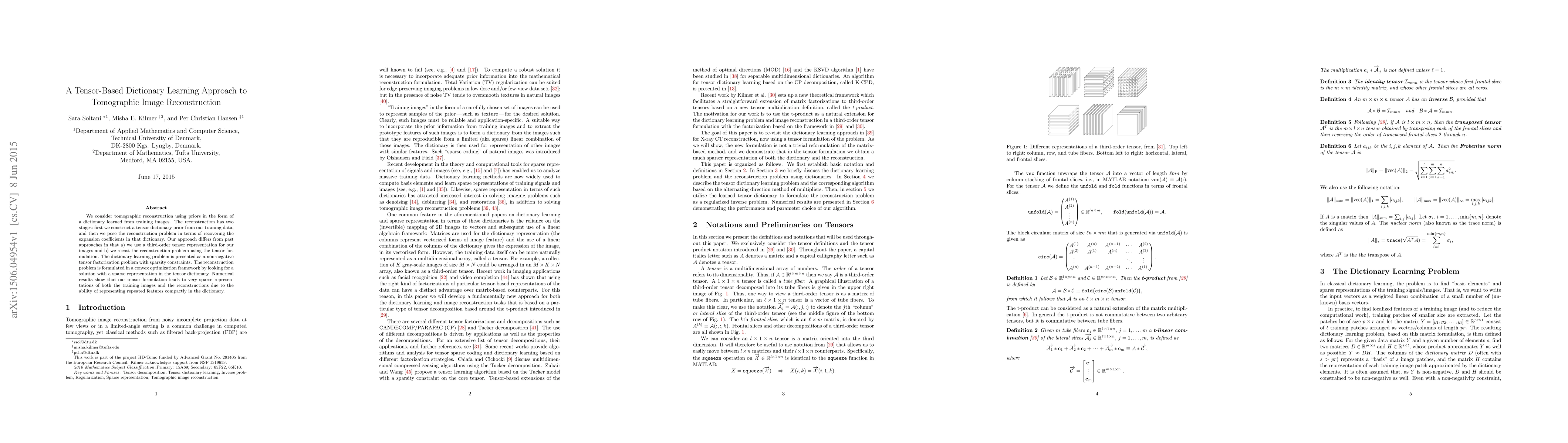 This paper proposes a tensor-based dictionary learning method for tomographic image reconstruction, utilizing a third-order tensor representation and a non-negative tensor factorization approach to achieve sparse representations. The method reconstructs images by finding sparse expansion coefficients in a tensor dictionary, leading to compact and efficient feature representation.