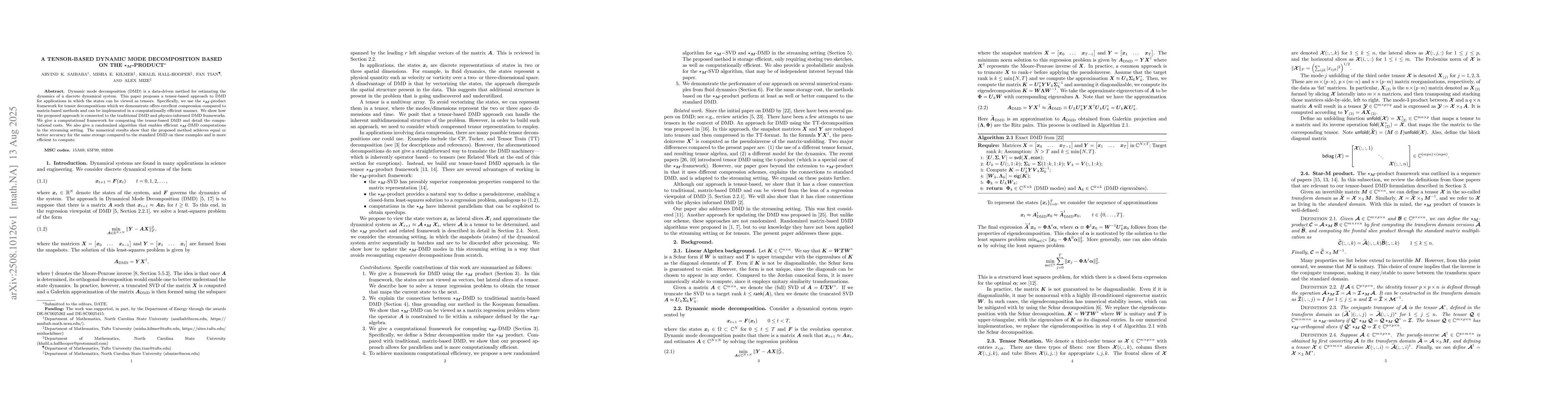 Dynamic mode decomposition (DMD) is a data-driven method for estimating the dynamics of a discrete dynamical system. This paper proposes a tensor-based approach to DMD for applications in which the states can be viewed as tensors. Specifically, we use the $\star_{\boldsymbol{M}}$-product framework for tensor decompositions which we demonstrate offers excellent compression compared to matrix-based methods and can be implemented in a computationally efficient manner. We show how the proposed approach is connected to the traditional DMD and physics-informed DMD frameworks. We give a computational framework for computing the tensor-based DMD and detail the computational costs. We also give a randomized algorithm that enables efficient $\star_{\boldsymbol{M}}$-DMD computations in the streaming setting. The numerical results show that the proposed method achieves equal or better accuracy for the same storage compared to the standard DMD on these examples and is more efficient to compute.