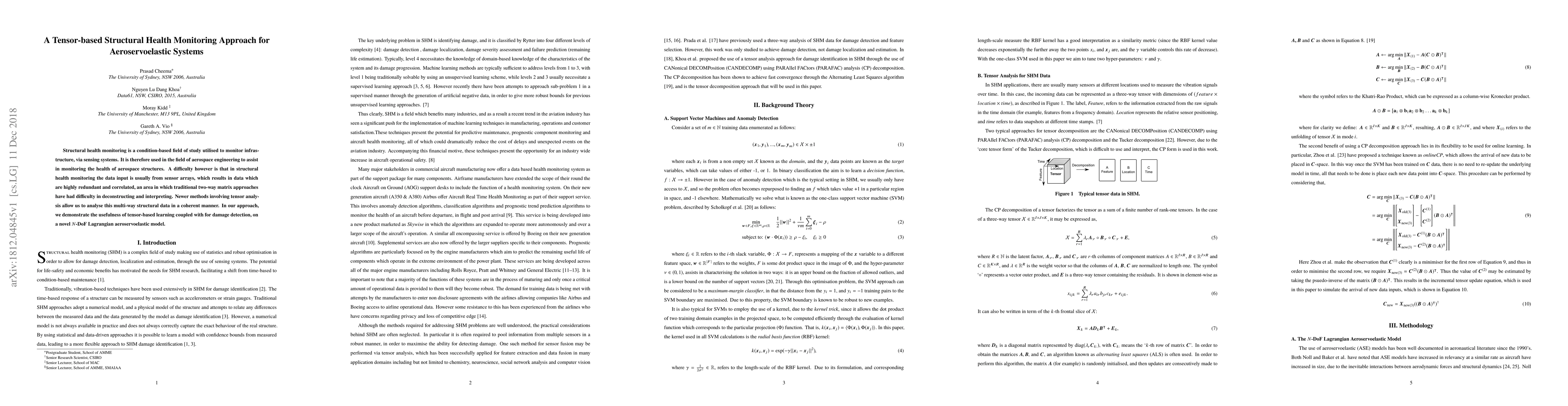 Structural health monitoring is a condition-based field of study utilised to monitor infrastructure, via sensing systems. It is therefore used in the field of aerospace engineering to assist in monitoring the health of aerospace structures. A difficulty however is that in structural health monitoring the data input is usually from sensor arrays, which results in data which are highly redundant and correlated, an area in which traditional two-way matrix approaches have had difficulty in deconstructing and interpreting. Newer methods involving tensor analysis allow us to analyse this multi-way structural data in a coherent manner. In our approach, we demonstrate the usefulness of tensor-based learning coupled with for damage detection, on a novel $N$-DoF Lagrangian aeroservoelastic model.