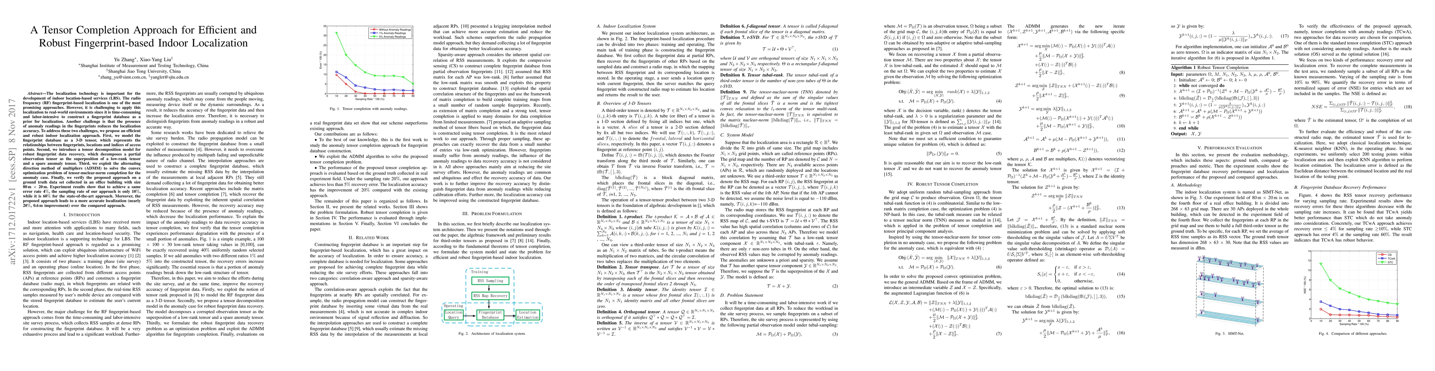 This paper proposes a tensor completion approach for efficient and robust fingerprint-based indoor localization, addressing the challenges of constructing a fingerprint database and handling anomaly readings. The method models the fingerprint database as a 3-D tensor and uses tensor decomposition to recover robust data, achieving a 4% error rate with a 10% sampling rate, outperforming existing methods by nearly 20% in accuracy.