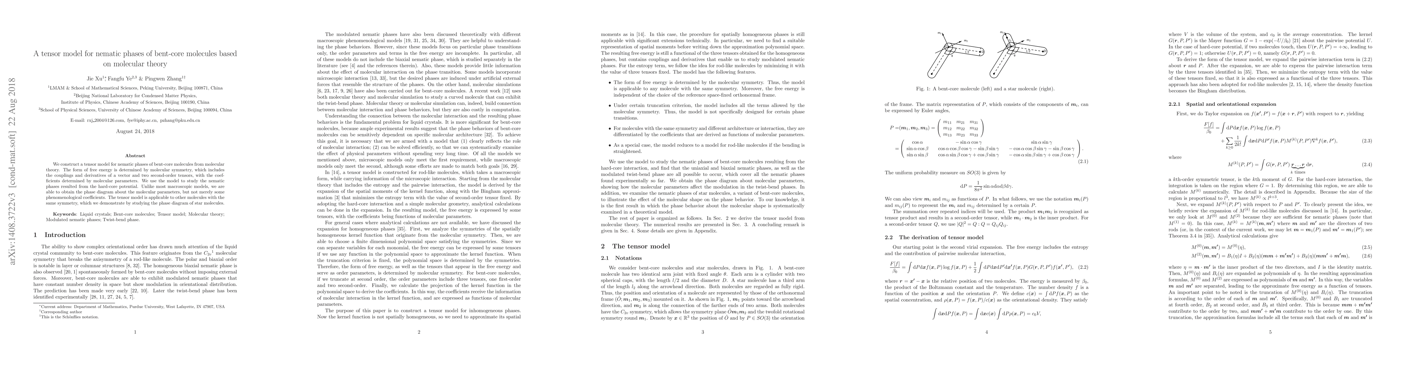 This paper constructs a tensor model for nematic phases of bent-core molecules based on molecular theory, determining the free energy form through molecular symmetry. The model provides a detailed phase diagram based on molecular parameters, applicable to other symmetric molecules like star molecules.